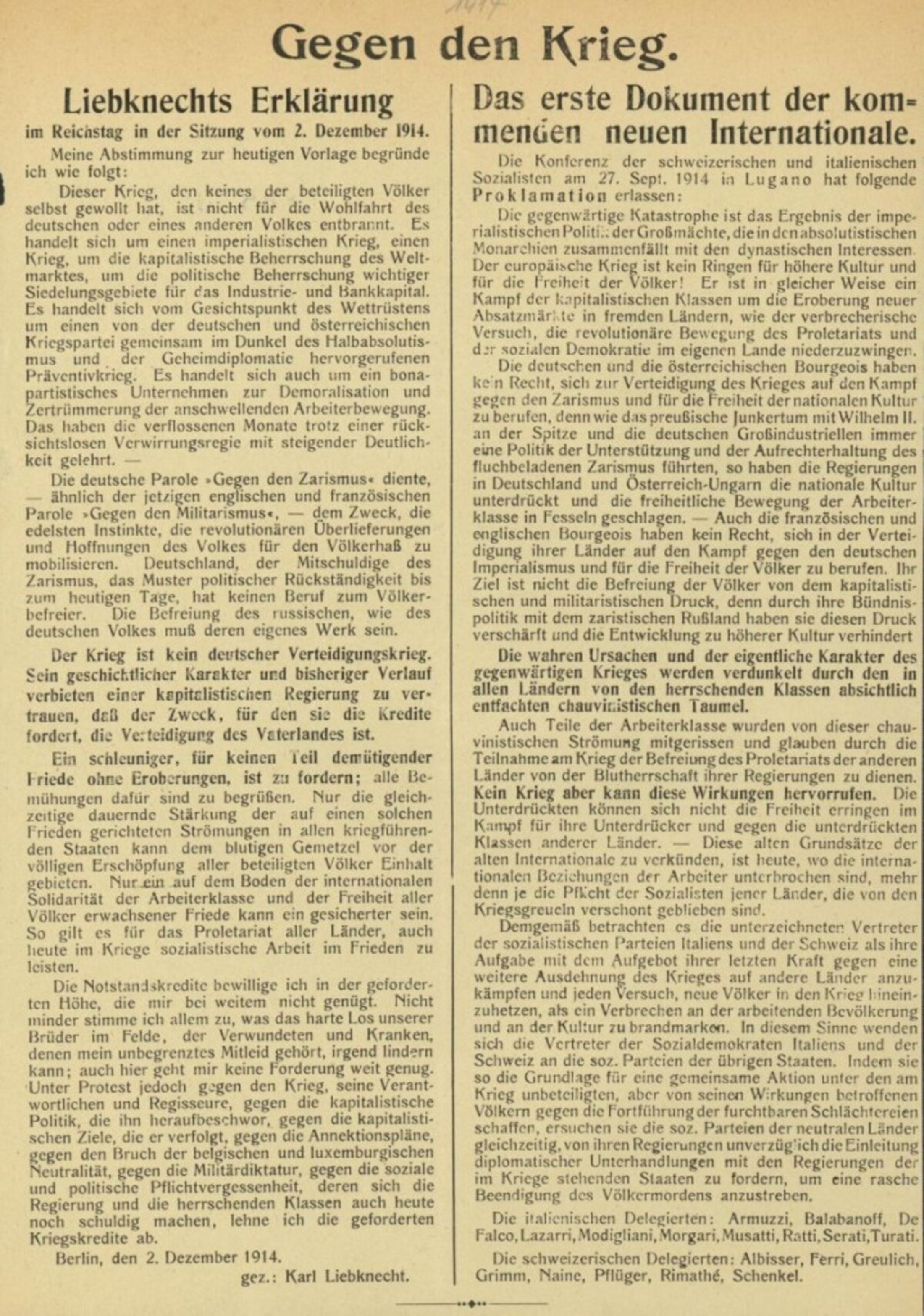 L'illustration : Karl Liebknecht gab noch in der Sitzung eine Erklärung zur Ablehnung der Kriegskredite zu Protokoll (linke Spalte), welche später als Flugblatt gedruckt wurde. Quelle: Archiv der sozialen Demokratie der Friedrich-Ebert-Stiftung, 6/FLBL005307.