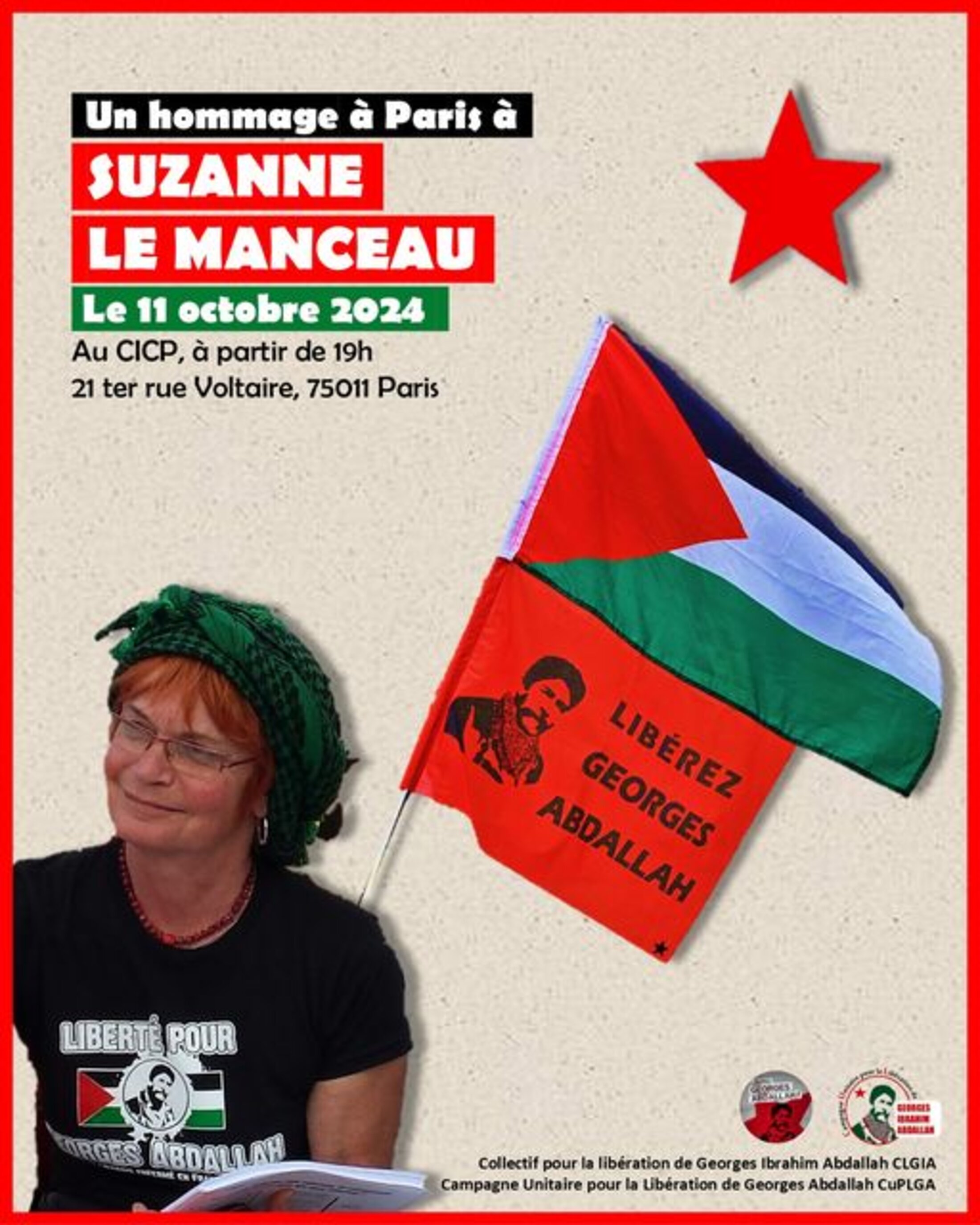 Aujourd'hui, une pensée occupe nos esprits : Hommage à Suzanne, cheville ouvrière depuis 2010 du soutien à Georges, inlassable militante pour la Palestine, de tous les combats pour la justice sociale, pour beaucoup, une amie très chère.
