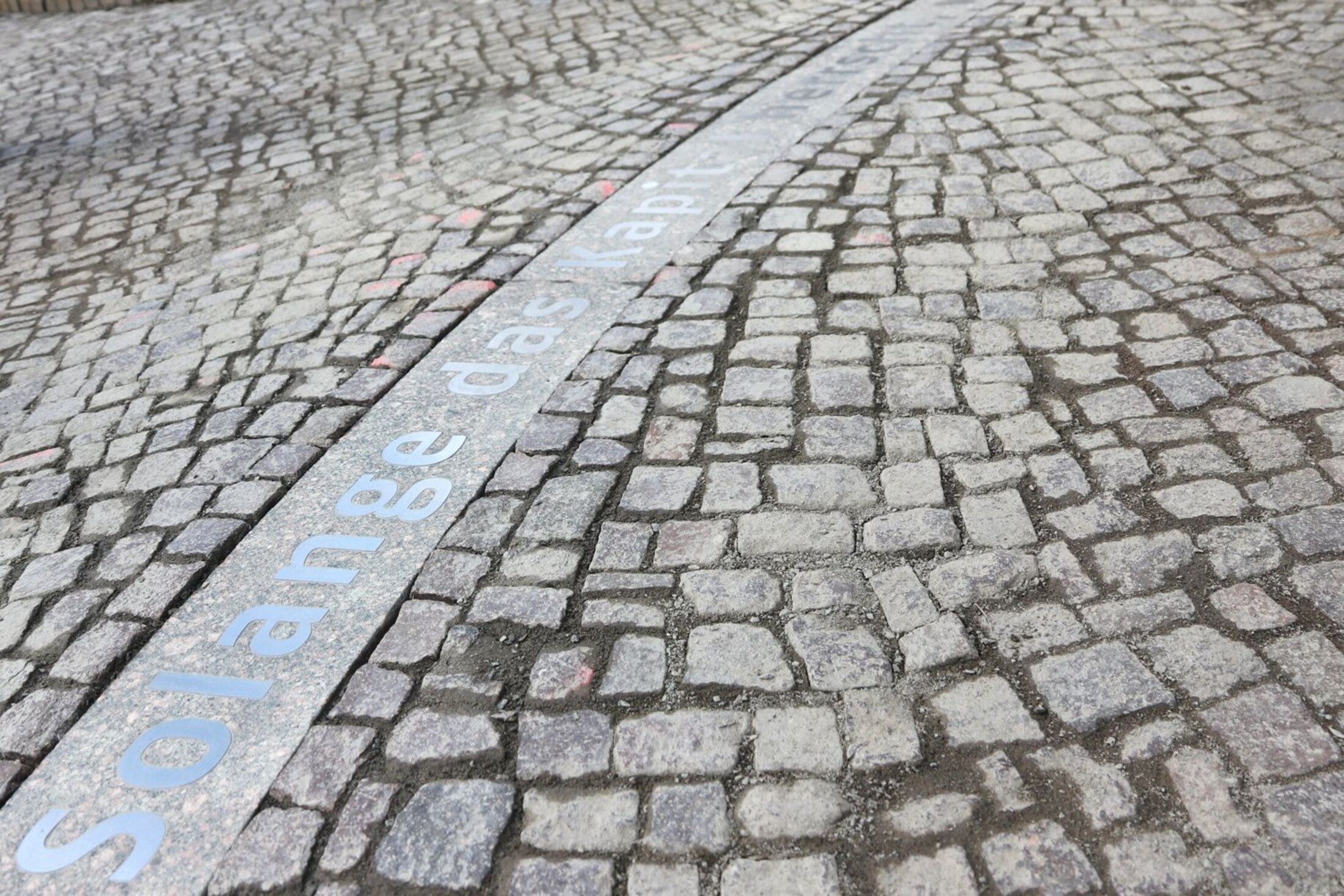 L'illustration montre la phrase gravée sur le sol devant la Felsenkeller où Rosa Luxemburg tint ce discours. Elle décrit ce meeting dans une lettre à Léo Jogiches le 28 mai 1913 : "Hier soir, j'ai tenu un meeting magnifique dans la plus grande salle de Leipzig. J'ai parlé de la politique mondiale et attaqué fermement le groupe parlementaire et l'ensemble de la tactique qui domine dans le parti. Mon discours a été accueilli par des tonnerres d'applaudissements et j'ai été remerciée officiellement.