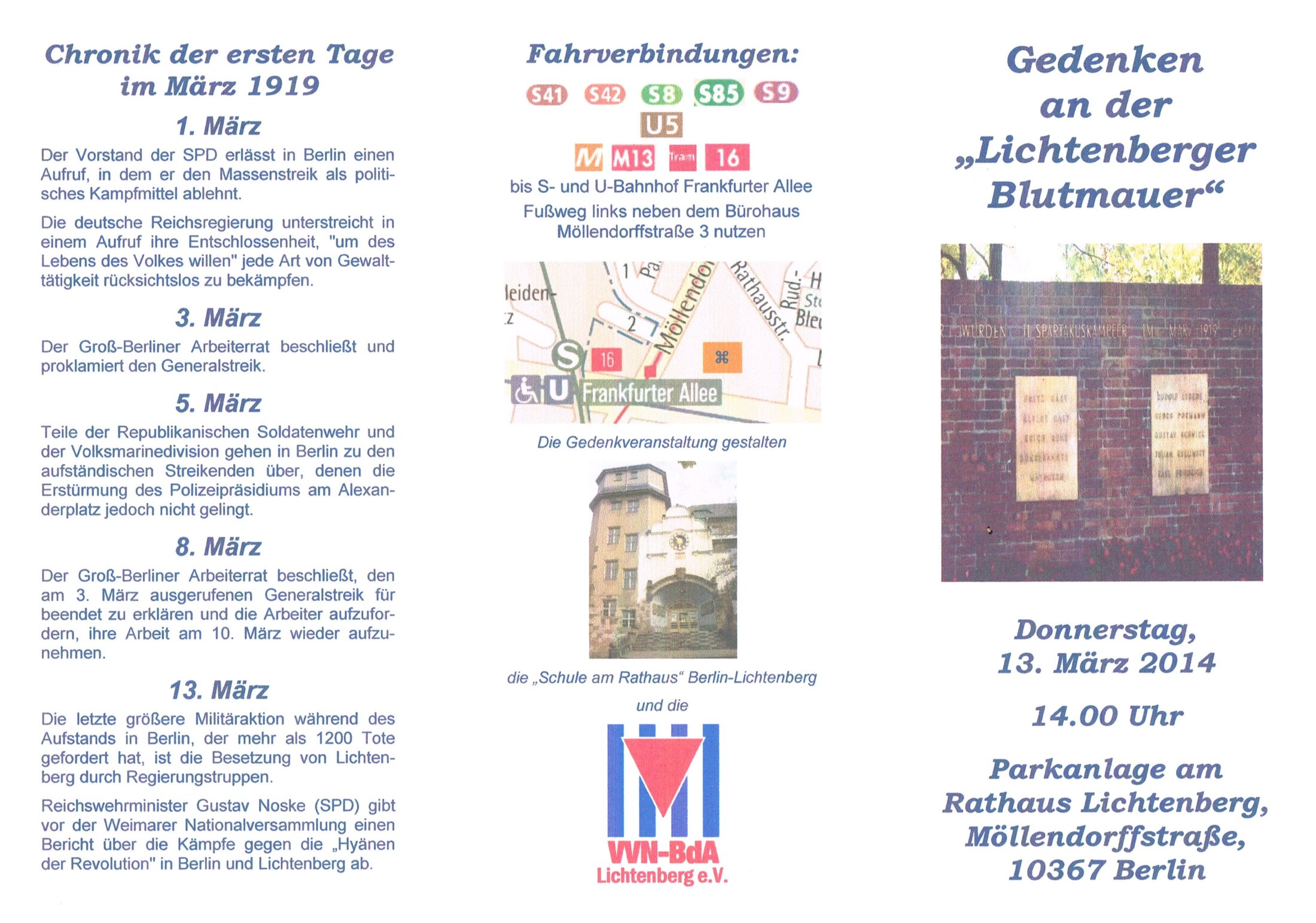 Lichtenberg, Berlin commémore les plus de 1200 victimes de la répression lors de la révolution de mars. Fausse nouvelle, arrestations, exécutions sommaires après le permis de tuer délivré par Noske, ministre social-démocrate, dont celle de L.Jogiches, compagnon de combat de R. Luxemburg, tanks, mines, même attaque aérienne contre un quartier populaire. Lichtenberg, La 2ème révolution..