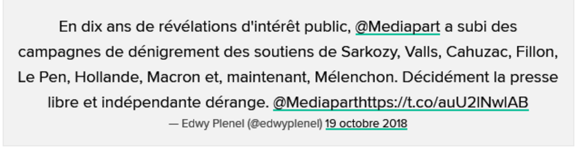 Nous assistons actuellement sur les pages de MDP un déferlement de haine vengeresse. La vendetta mélenchoniene est à l’œuvre, la bave au coin des lèvres les menaces fusent sur tous les tons. La melenchonie a sonné l'alarme et une horde de militants FI se déchaine sur ceux qu'elle adulait à l'occasion de l'affaire Cahuzac, de l'affaire Sarkozy etc...A lumiere de ces affaires, MDP avait démontré que le pouvoir en place ne le ferait pas plier. Aujourd'hui nous assistons à un chantage aux désabonnements des fans de Melenchon "le patron", mais encore une fois MDP ne faiblira pas et prouve que seule son indépendance est bien une réalité. On ne peut que se féliciter qu'il soit fidèle à son engagement.