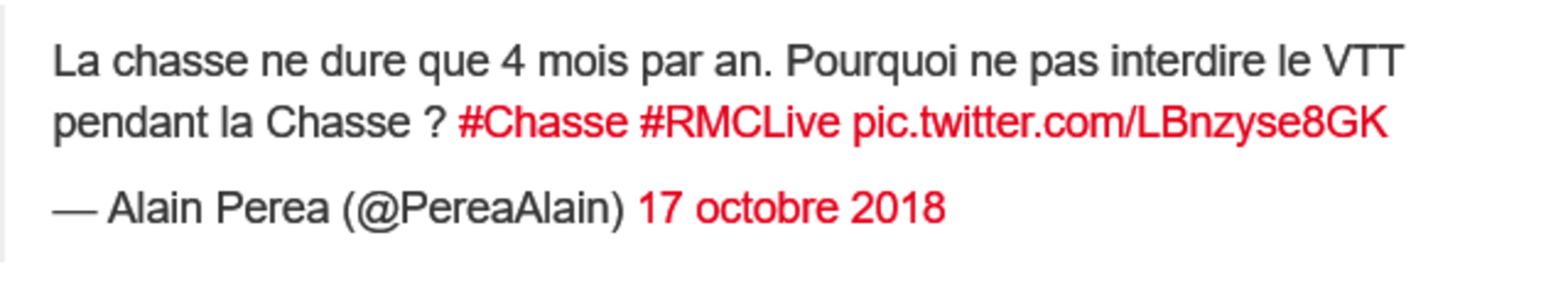 Suite à la mort d'un cycliste britannique tué par un chasseur en Haute-Savoie la semaine dernière, le Député LREM de l’Aude et passionné de chasse, Alain Péréa a publié mercredi sur son compte Twitter un message dans lequel il propose l’interdiction de la pratique du VTT pendant la saison de chasse. !
