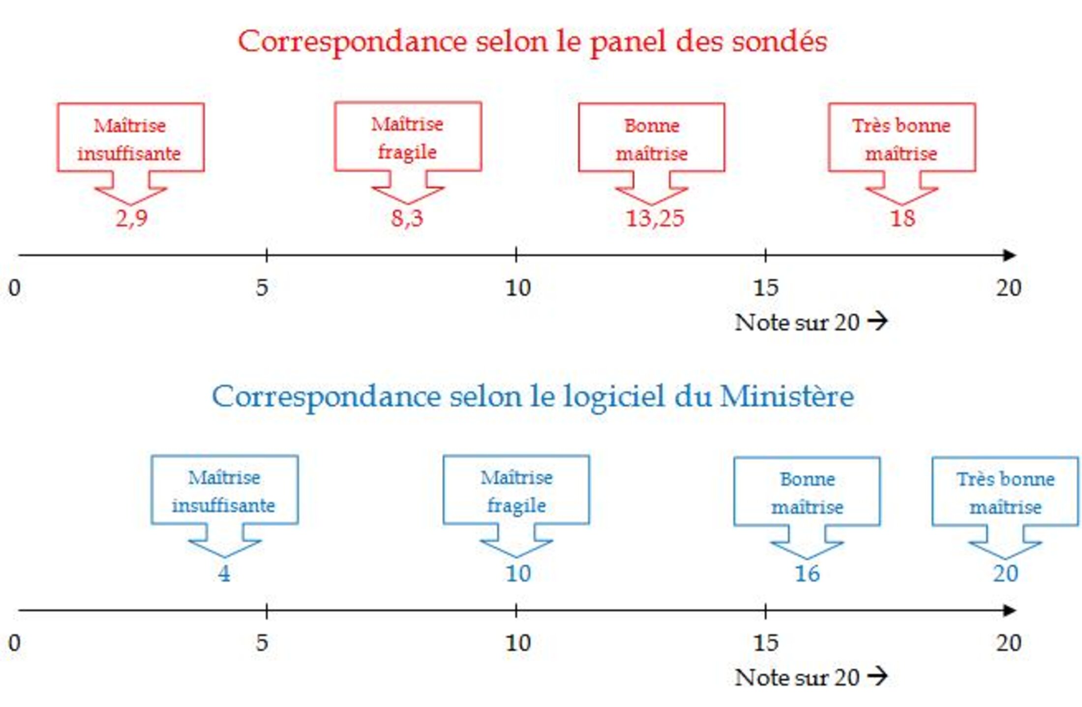 Prenant modèle sur ce qui se passe dans les pays du Nord de l’Europe, le ministère a tenté de passer d’une notation chiffrée à une notation par compétences. L’affaire n’est pas nouvelle… tellement peu nouvelle que le Livret Personnel de Compétences, mis en place en 2008, est déjà mort comme nous l’expliquions dans cette autre note de blog. C’est un peu logique : on a vécu 8 ans dans l’absurdité qui consiste à faire cohabiter deux systèmes d’évaluation parallèles (les notes induisent une évaluation progressive de 0 à 20 / alors que les compétences ont pour logique d’être « validées », sous forme de cases à cocher). Mais voilà : il faut bien des notes précises pour gérer les affectations après la 3ème. Le « contrôle continu » qui compte pour le Brevet des collèges ne sera donc plus composé d’une moyenne de notes, mais d’une suite réduite de 8 compétences évaluées en « fin de cycle » (traduisez en fin de 6ème et en fin de 3ème, en juin), qui devra être remplie par l’ensemble des professeurs de la classe, en réunion. Pour chacune des compétences il faudra juger si l’élève est à une « maitrise insuffisante » ou une « maitrise satisfaisante », une « bonne » ou une « très bonne maitrise ». Ces appréciations seront converties en points. Après tout, les mots « maitrise insuffisante » « bonne maitrise » etc signifient quelque chose, tout comme les mentions « assez bien » « très bien ». Le Ministère a donc donné d’emblée une table de conversion numérique des 4 appréciations. La trouvant un peu curieuse, nous avons fait un petit sondage auprès d’une vingtaine de personnes (il ne vaut donc que pour sa valeur indicative), en leur demandant quelle note signifiait pour eux « maitrise insuffisante », « très bonne maitrise » etc. Nous avons veillé à prendre des personnes d’âge varié et de niveau de diplôme varié aussi. Après avoir entendu deux fois la remarque fort censée « maitrise insuffisante et fragile, ça doit être la même chose, non ? » Nous avons été étonnés par la concordance des résultats entre eux… eux-mêmes bien discordants avec la traduction chiffrée du Ministère.
