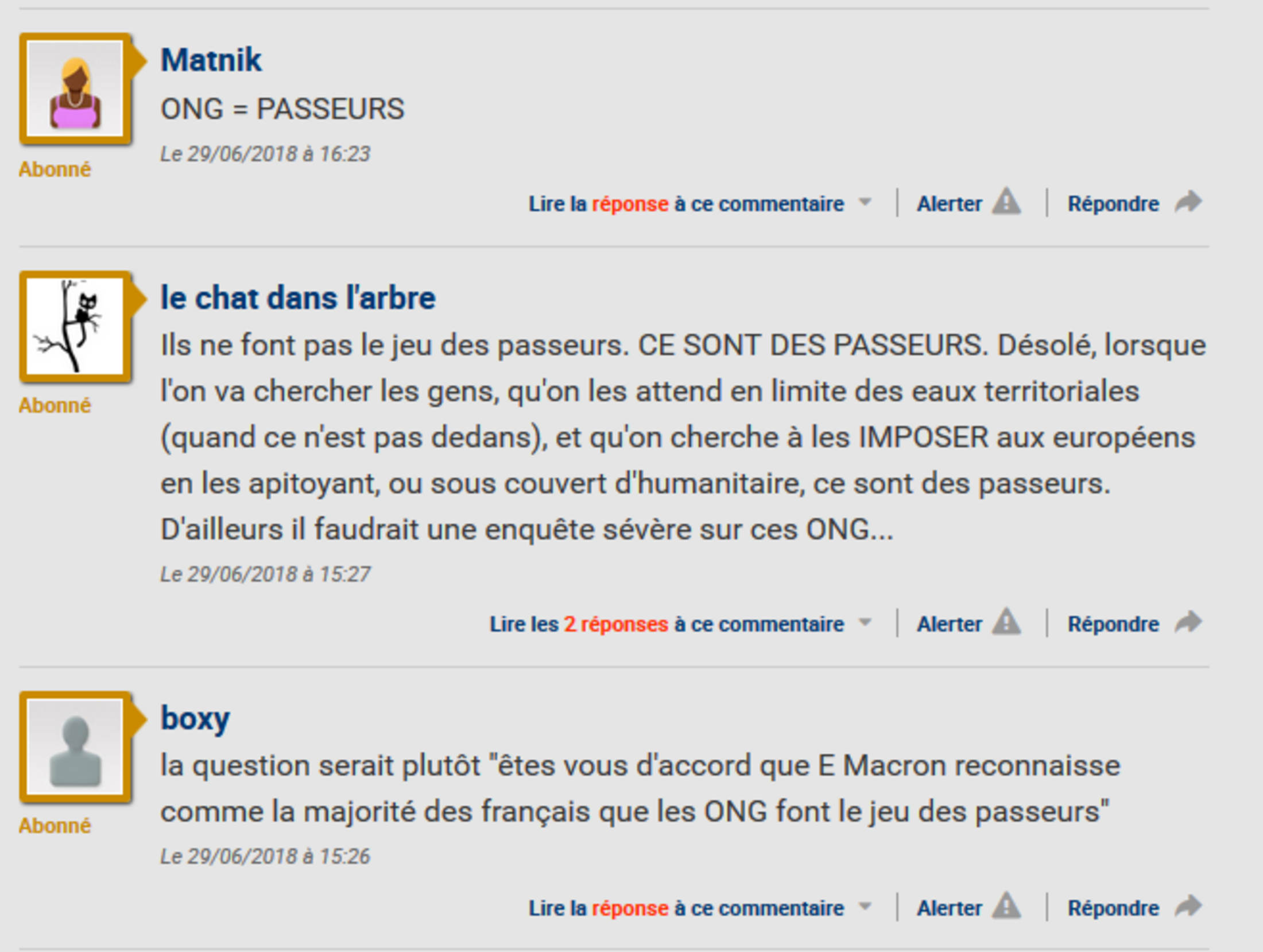 Le terme ONG est ainsi régulièrement repris sur les réseaux sociaux en des termes péjoratifs, certains les considérant comme des dangers à la sécurité nationale ou bien encore la porte d'entrée des migrants...
