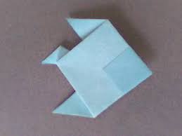 Je leur ai alors donné les carrés découpés et laissés de côté précédemment et leur ai montré le pliage en les aidant beaucoup. Le grand comprenait très vite et aidait les autres à son tour. Finalement, chacun a eu son oiseau plus ou moins fabriqué par lui.