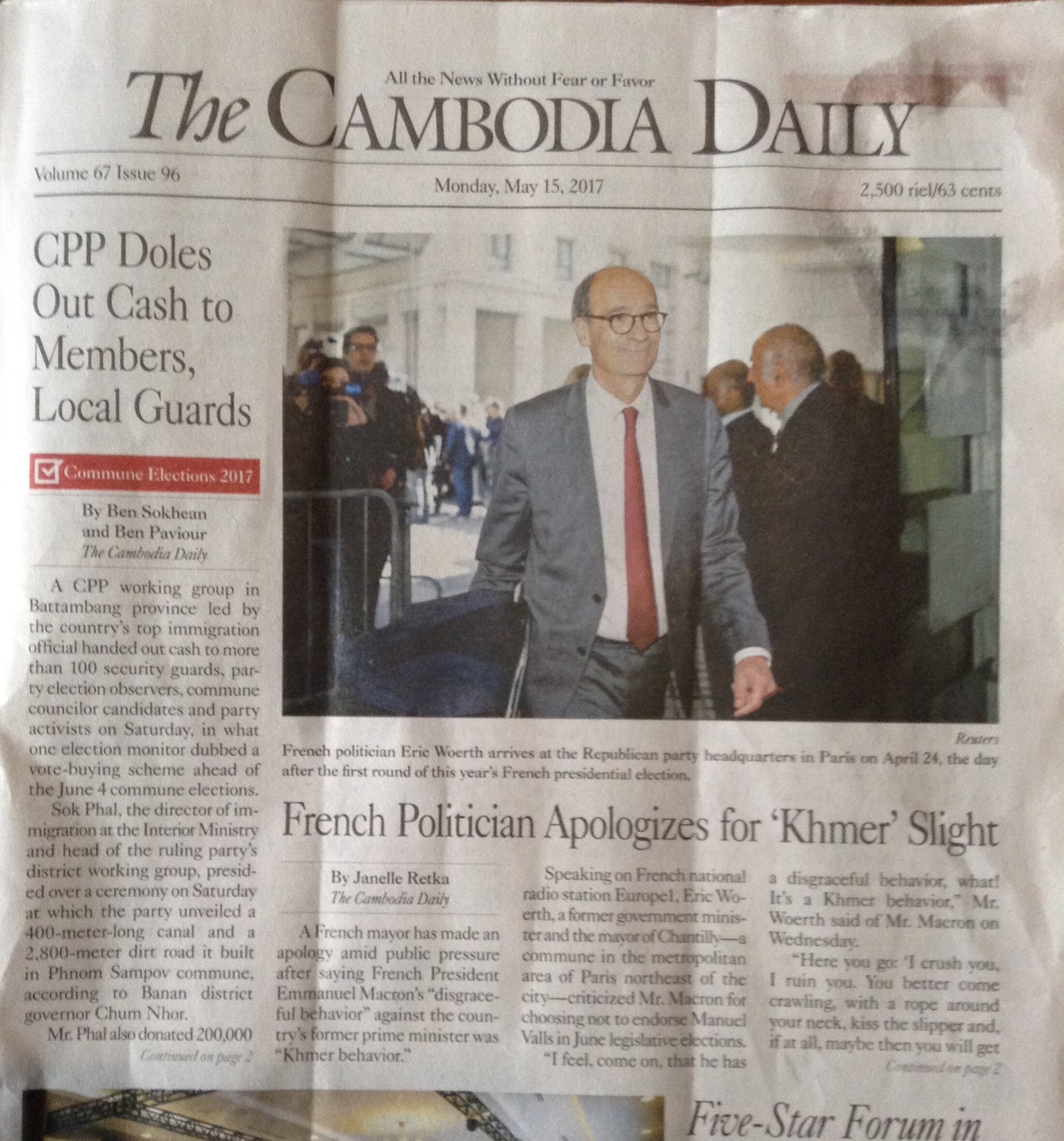 Voilà Eric Woerth et en première page d'un journal à Phnom Penh, ce matin! Vous savez celui qui a vendu un hippodrome à ses amis.