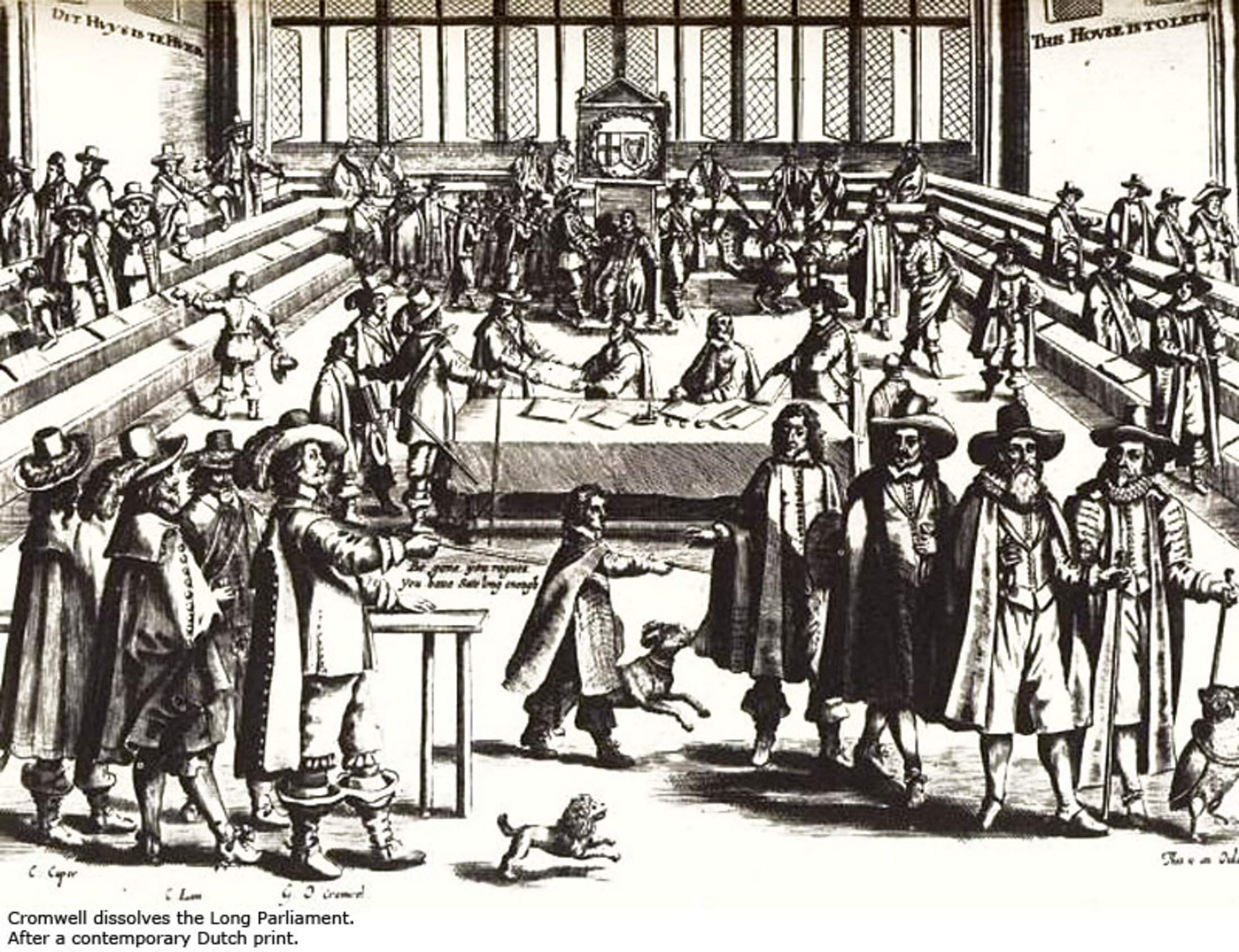 Après la défaite de Charles Ier, en 1648, le Conseil de l'armée s'oppose au Parlement en exigeant la déchéance du roi. Face à son refus, l'armée s'empare du roi et le Parlement est purgé au nom de l'"Agreement of the People". Ce texte de nature constitutionnelle, rédigé par les Niveleurs, réclamait le suffrage universel et une meilleure représentativité du Parlement. Sur ces bases, les Niveleurs réclament de nouvelles élections. Mais, le 4 janvier 1649, le Parlement purgé (dit "Parlement croupion") s'auto-proclame souverain et s'accorde le droit de légiférer sans la Chambre des lords et sans le souverain. Les protestations sont réprimées par Cromwell et le Parlement proclame la république le 16 mai sous le nom de "Commonwealth", confiant l'exécutif à un Conseil d'Etat. Mais, placé sous l'entière dépendance des militaires plutôt que du peuple, le Parlement est finalement dissous par Cromwell le 20 avril 1653.