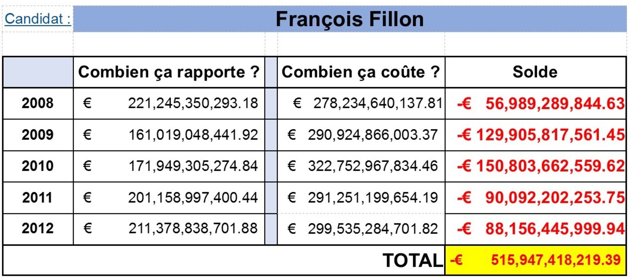 Nous pouvons donc affirmer avec certitude combien coûte et combien rapporte le candidat François Fillon.