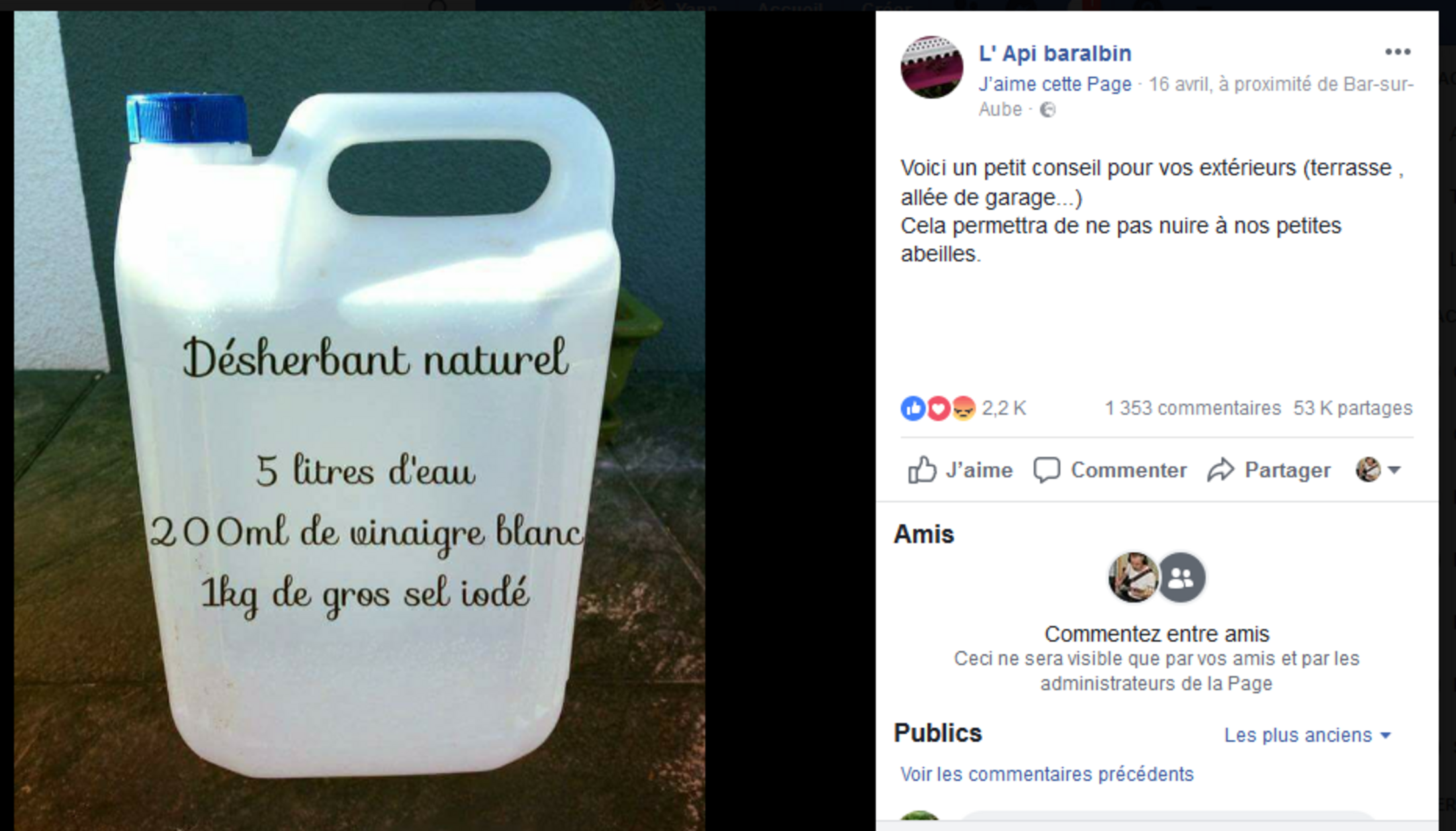 Mais la palme d’or de l’alternative naturelle au glyphosate potentiellement la plus stupide est sans conteste attribuée à cette recette de grand-mère que j’ai pu voir circuler sur la page Facebook d’une copine, et qui est proposée par des apiculteurs soucieux de protéger leurs abeilles :