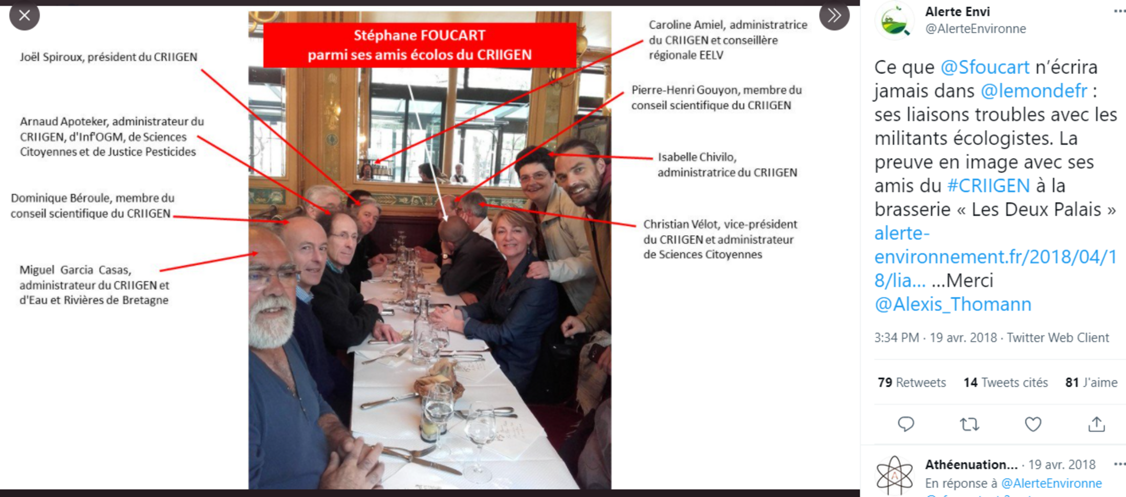 On peut penser que l’alerte avait été lancée dès la réunion du 4 avril 2017, qui évoquait la situation suivante : « Robin Mesnage a dernièrement publié un article avec 20 auteurs scientifiques, dont Pete Myers, sur l’état des connaissances du glyphosate, la polémique et les solutions. Gilles-Eric Séralini qui connait bien Pete Myers pour l’avoir convié à un séminaire CRIIGEN afin de lui présenter ses travaux de recherche sur ce sujet, a été très surpris à la sortie de cet article de ne pas avoir été ni sollicité ni remercié. D’autres scientifiques du Criigen partagent ce point de vue. »