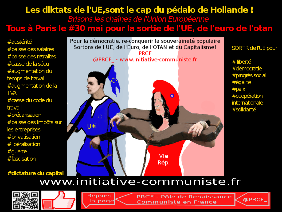 30 mai dernier en se réunissant près du Palais-Bourbon pour réclamer la sortie de l’UE à l’initiative des Assises du communisme : ce rassemblement, le principal qui se soit tenu en France à ce niveau quantitatif et qualitatif, est une étape historiquement importante : alors, continuons, approfondissons, camarades, c’est sur la lutte pour les quatre sorties que tous les vrais communistes, membres ou pas du PCF, peuvent se fédérer, aller ensemble aux entreprises et aux manifs pour apporter du neuf, s’émanciper de la direction euro-dépendante du PCF, fédérer fraternellement des non-communistes et des syndicalistes de bonne volonté. Mais cela ne suffit pas. Ce combat doit entrer de plus en plus dans le mouvement social et syndical car les syndicats ne retrouveront pas leur indépendance de classe envers le MEDEF, le PS et l’UE tant qu’ils n’entreront pas en conflit ouvert avec la machine bureaucratique de la CES et du syndicalisme perdant « rassemblé » autour de l’agent orange de l’UE (la direction CFDT). Enfin, ce combat il faut le mener ensemble, entre forces progressistes. Derrière les querelles de clans, c’est cette aspiration à la reconquête de l’indépendance de classe qui inspire la contestation interne dans la CGT, que l’orientation euro-dépendante met en danger de mort. Et pour cela, le PRCF prendra davantage appui qu’il ne l’a fait sur son programme communiste de lutte élaboré par la 3ème conférence nationale de l’organisation.