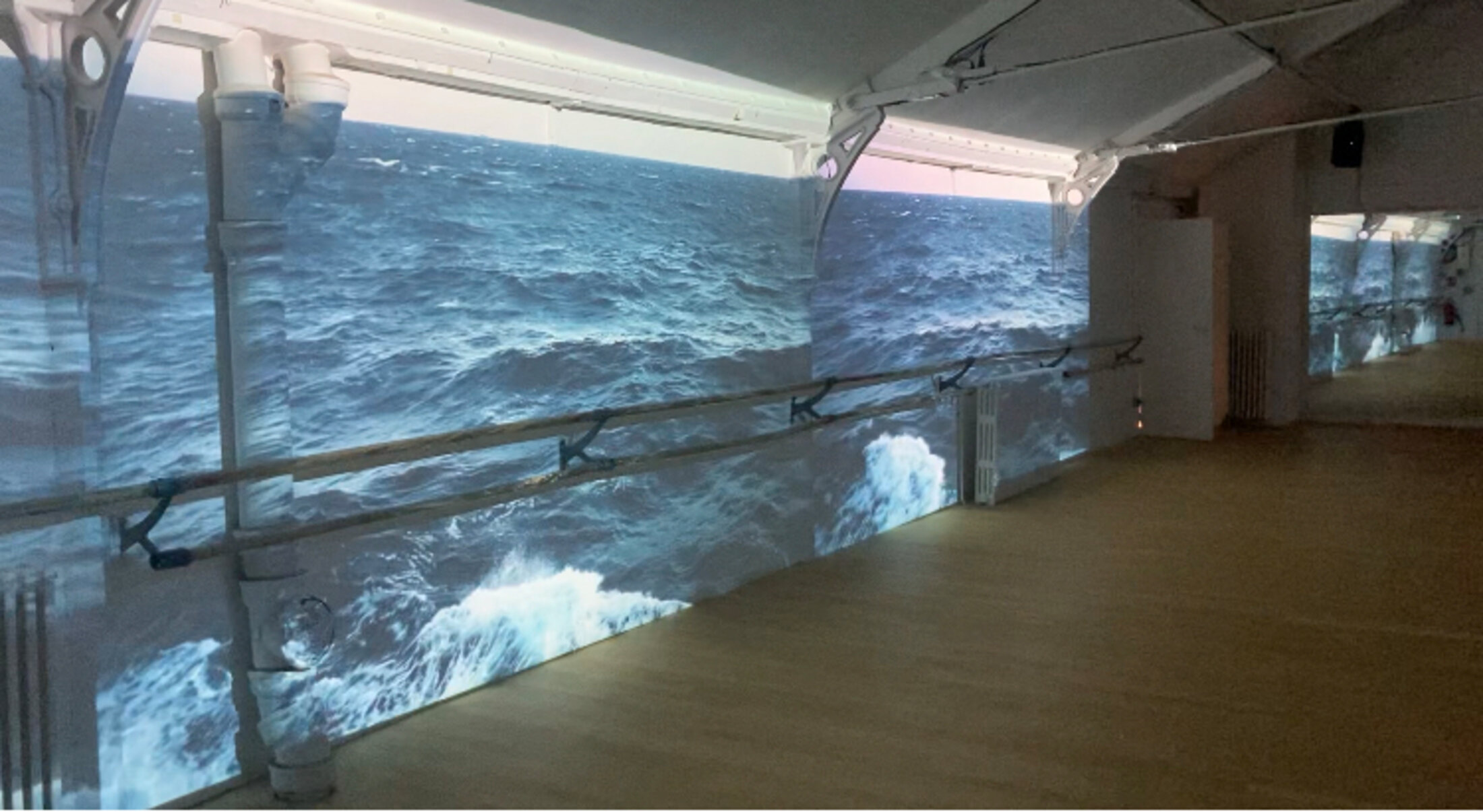 Les portes s’ouvrent et les séquences se répondent en jeux de miroir, ajoutant au montage ce beau souci de nouvelles perspectives. Le parquet craque et devient le pont d’un paquebot, tandis que les barres de danse sont transformées en bastingage par les projections de l’océan sillonné par le Costa Concordia. Un piano sommeille, et pourtant notre musique est bien là, la voix sépulcrale aussi, chuchotant à nos oreilles dans le couloir, passage du Styx en stéréo augmentée.