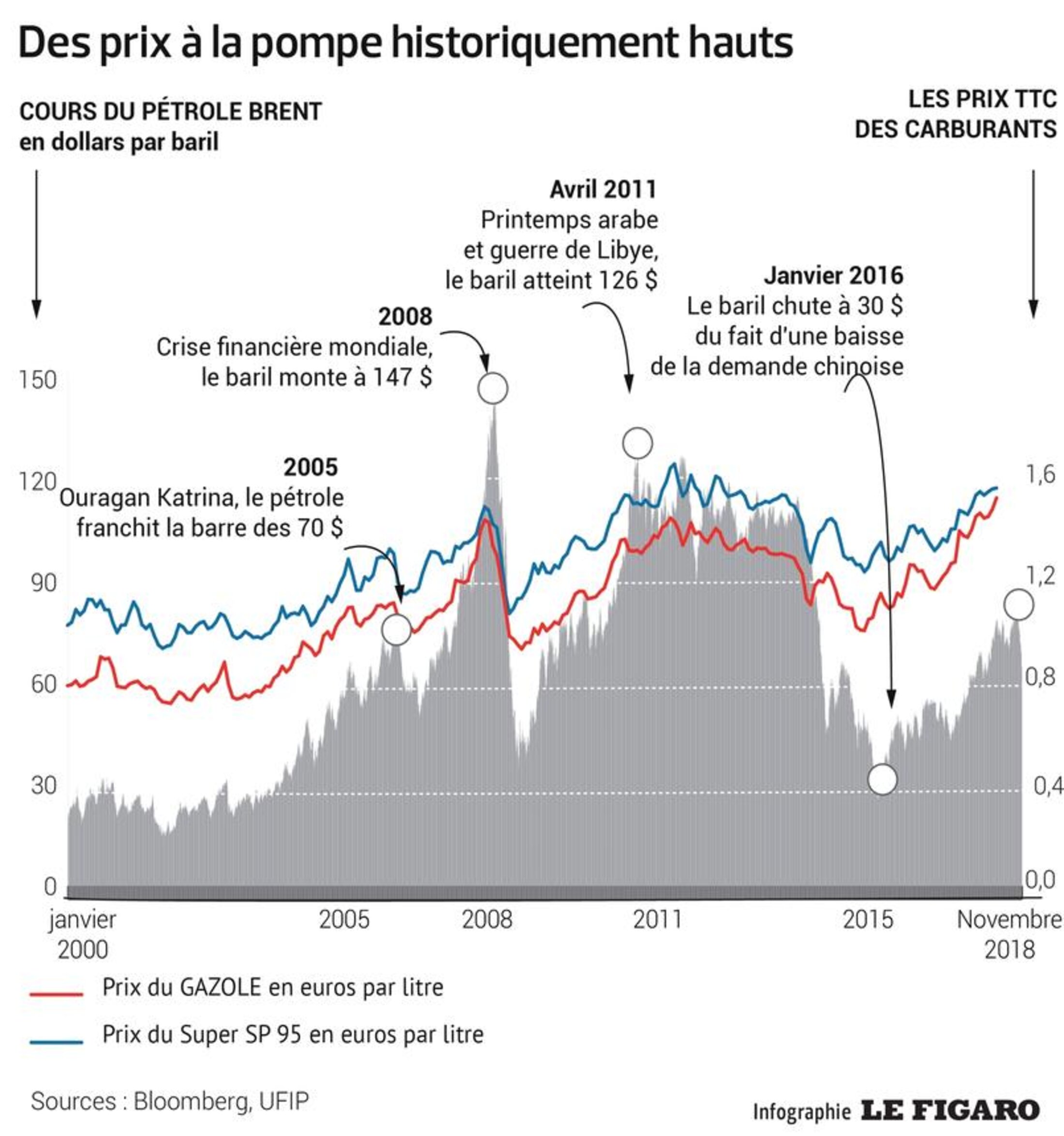 Après avoir été stable pendant plus de trois ans, autour des 110 dollars, le pétrole a ensuite entamé une chute vertigineuse en juin 2014, pour redescendre à 30 dollars le baril en janvier 2016. Cette baisse s'inscrivait dans un contexte marqué par une baisse de la demande mondiale, notamment chinoise, une rivalité entre les États-Unis et l'Arabie Saoudite pour le contrôle des marchés, ou encore le retour de l'Iran sur le marché du pétrole. À la pompe, quelques mois plus tard, les automobilistes ont vu leur facture de carburant baisser. Mais dans une moindre mesure que le cours du pétrole brut sur les marchés mondiaux, car les prix des carburants dépendent pour beaucoup de variables indépendantes des fluctuations du brut sur les marchés mondiaux, comme le coût du produit raffiné. Mais surtout des taxes prélevées par l'État qui pèsent dans le prix final à la pompe, notamment la TVA (19,6% à l'époque) et la taxe intérieure de consommation sur les produits énergétiques (TICPE), quatrième recette de l'État et dont le montant est fixe. Depuis deux ans, les automobilistes s'étaient toutefois réhabitués à des pleins entre 1, 1 ou 1,3 euro en moyenne le litre selon le carburant.
