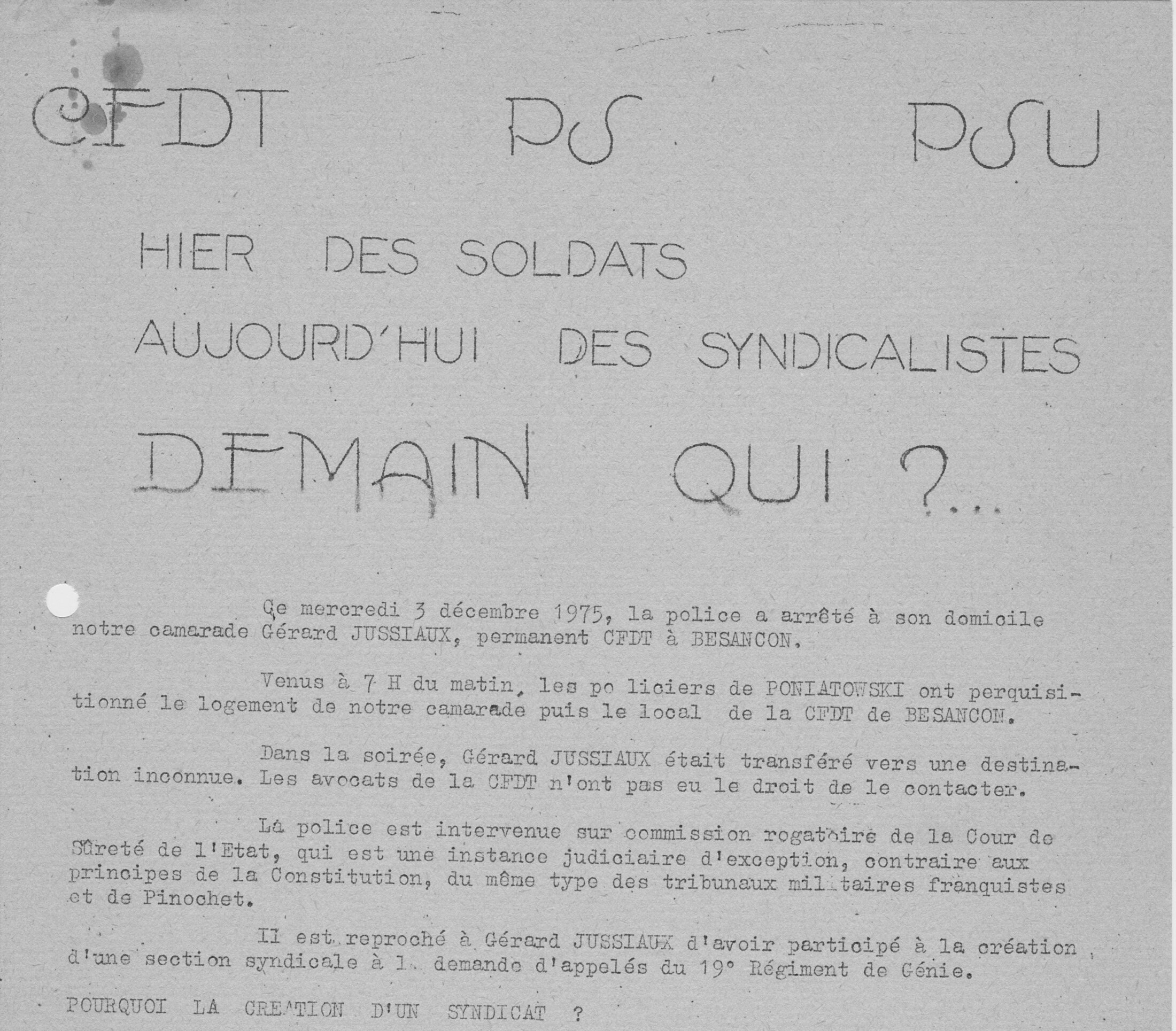 Mais les gazettes passent carrément sous silence un des exploits de Chirac : avoir en 1975, alors premier ministre de Giscard, fait arrêter des militants (dont des responsables syndicaux) parce qu’ils avaient soutenu des soldats dont les conditions d’encasernement étaient déplorables. Ils firent de la prison pour rien, et l’affaire fut finalement, des années plus tard, classée sans suite. L’un de ces syndicalistes était (est) un ami, Gérard Jussiaux. J’ai raconté cette histoire qui n’honore pas Jacques Chirac.