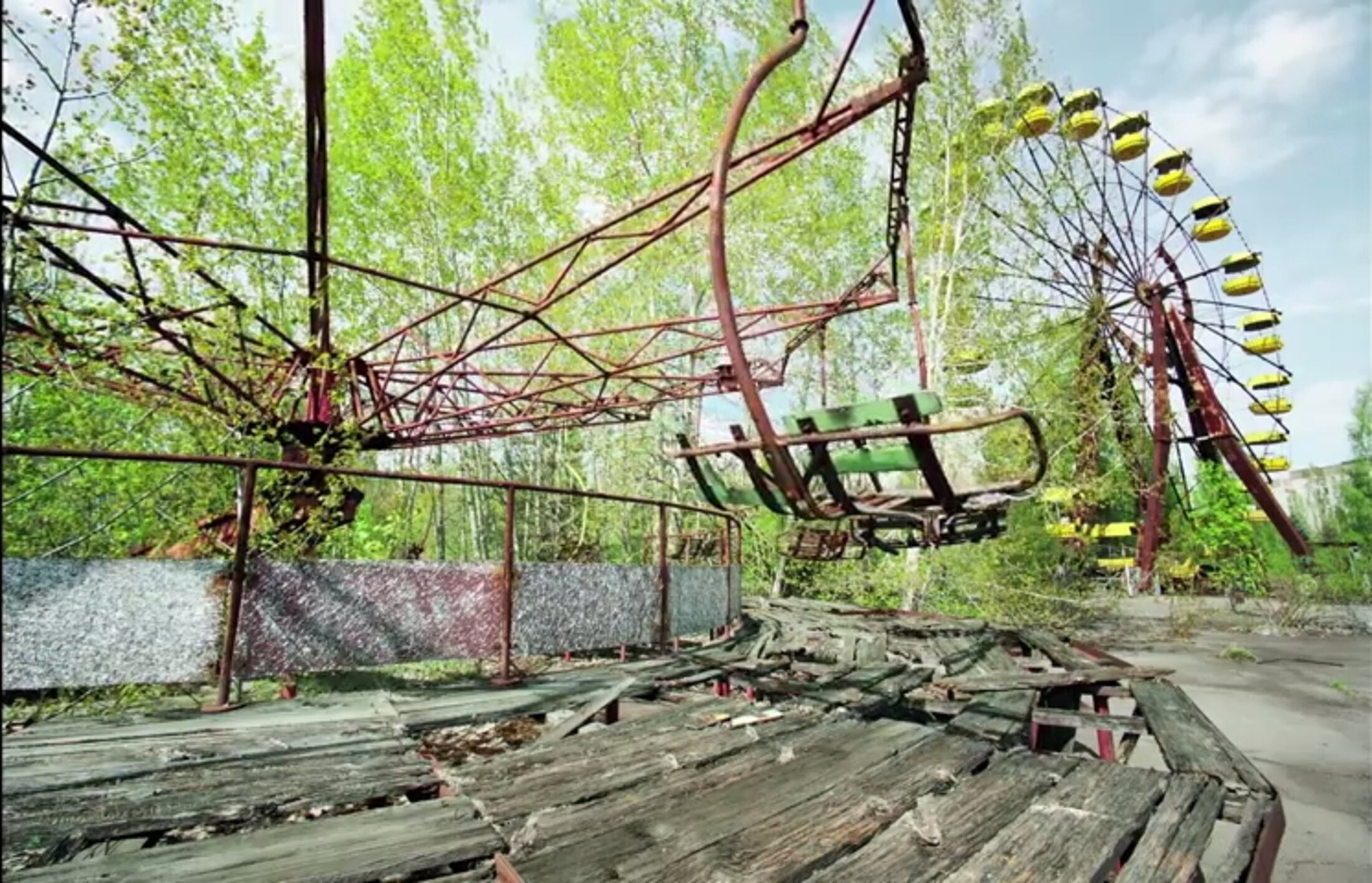 On le sait l'explosion du réacteur a été l'équivalent de 350 bombes d'Hiroshima : il a brûlé pendant dix-huit jours. Des centaines de milliers d'hommes ont combattu inlassablement pour "nettoyer" : parmi ces "liquidateurs", sans doute des milliers de morts. Des jeunes gens souvent. Et des dizaines de milliers de personnes mortes ou handicapées. Quelques cadres se sont suicidés face à l'ampleur de la catastrophe qu'ils avaient provoquée par leur imprudence. La ville la plus proche, Pripyat, évacuée (200 000 habitants), est devenue une ville fantôme. Subsistent des manèges, impassibles, fidèles au poste.