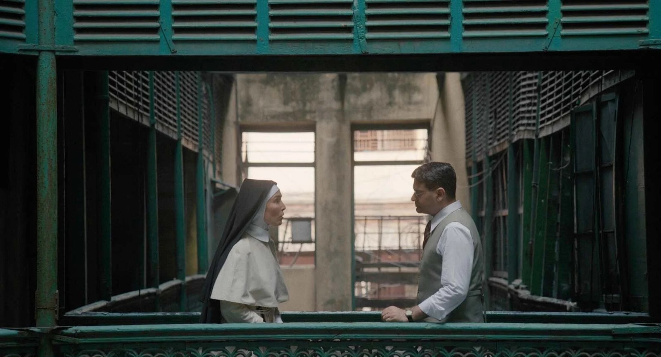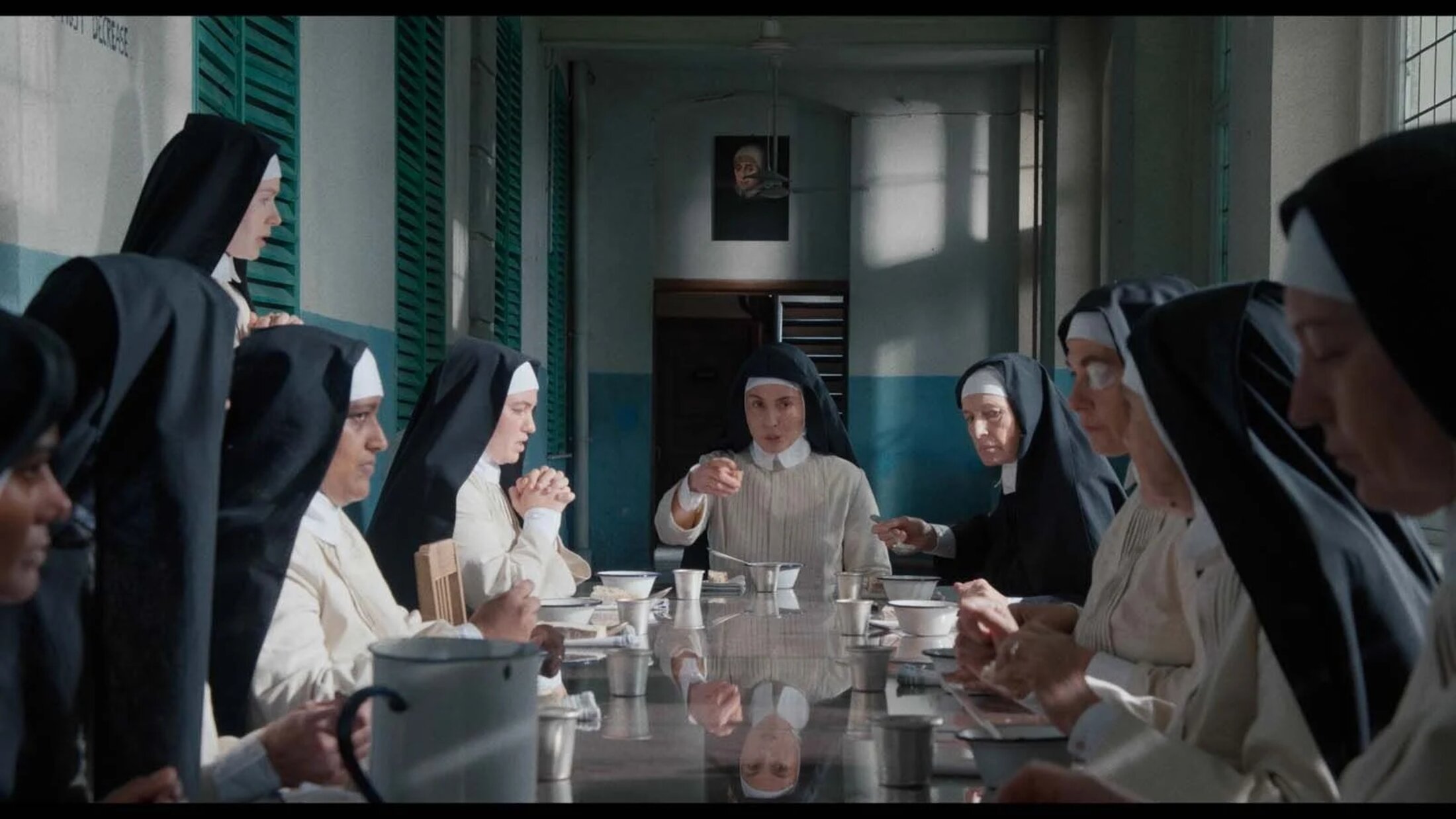 On est d’emblée plongé dans un quartier pauvre de Calcutta : Teresa a fait des boulettes de pain qu’elle distribue dans les taudis. Noomi Rapace qui incarne la religieuse, au physique impressionnant, a le visage émacié. Son ordre est enseignant (des petites écolières en rose), alors elle va en cachette dans la rue, laver les pieds, les corps des affamés. Elle s’identifie à cette marée humaine exsangue : « j’ai perdu encore un enfant aujourd’hui ». Elle est rigoriste, on la voit déplacer des meubles pour qu’on ne s’attache pas au matériel, elle veut donner des numéros aux sœurs pour qu’il n'y ait pas de favoritisme. La règle de l’ordre doit prévoir qu’une religieuse ne doit recevoir une visite de sa famille que tous les dix ans. Les cheveux sont coupés (les novices sont en pleurs) mais la Mère garde ses longs cheveux. Une sœur lui baise les pieds. Elle est stricte dans les comptes, contrôle la moindre roupie.