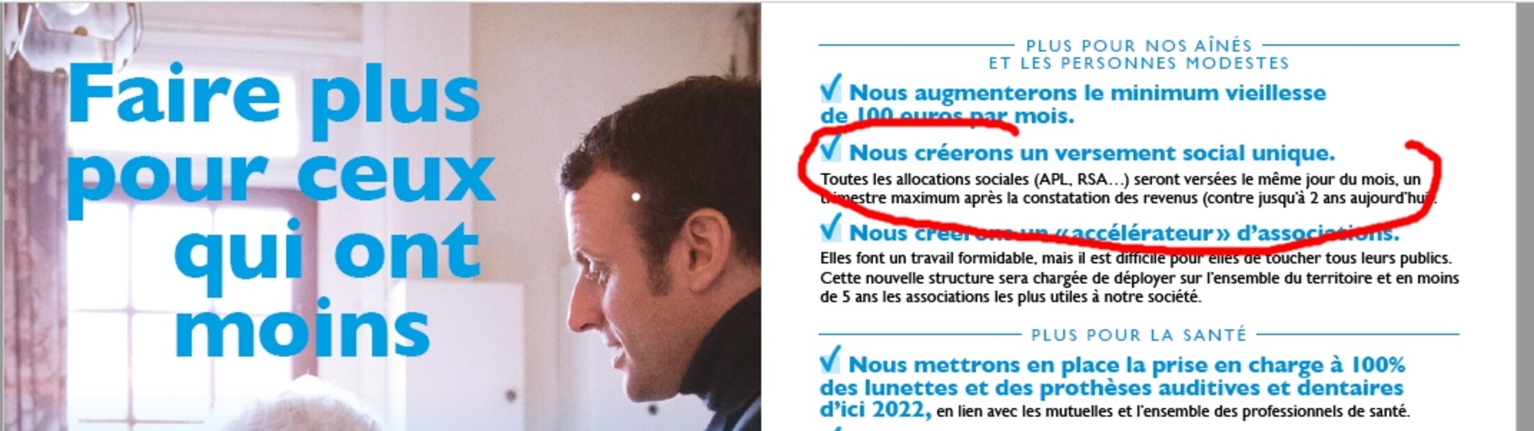 Le candidat Macron à la présidentielle n'avait pas parlé d'allocation sociale unique (ASU) mais il avait annoncé qu'il instaurerait "un versement social unique", c'est-à-dire que "toutes les allocations sociales (APL, RSA…) seraient versées le même jour du mois", après évaluation des revenus sur le trimestre précédent et non pas en remontant sur deux ans. Ce qui est déjà le cas de certaines prestations mais c'était une façon d'agiter le cocotier au moment où Benoît Hamon parlait, lui, d'un revenu universel et François Fillon d'une allocation sociale unique.