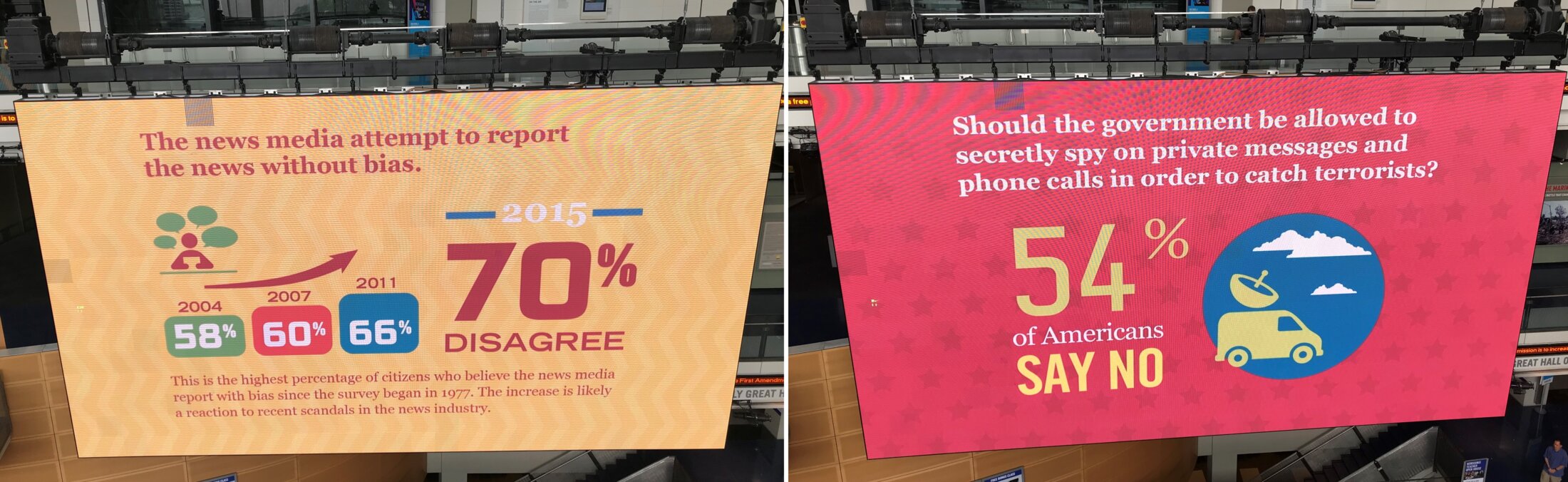 Plus intéressants m’ont semblé être la présentation de centaines de photos des Prix Pulitzer depuis 1942, l'affichage de panneaux numériques portant sur la liberté d’informer, l'exposition de collections de Unes des journaux du monde entier (accessibles toujours sur le site) et ainsi que le Mémorial des Journalistes tués dans l’exercice de leur métier (on y reconnaît, entre autres, Wolinski et Anna Politovskaïa).