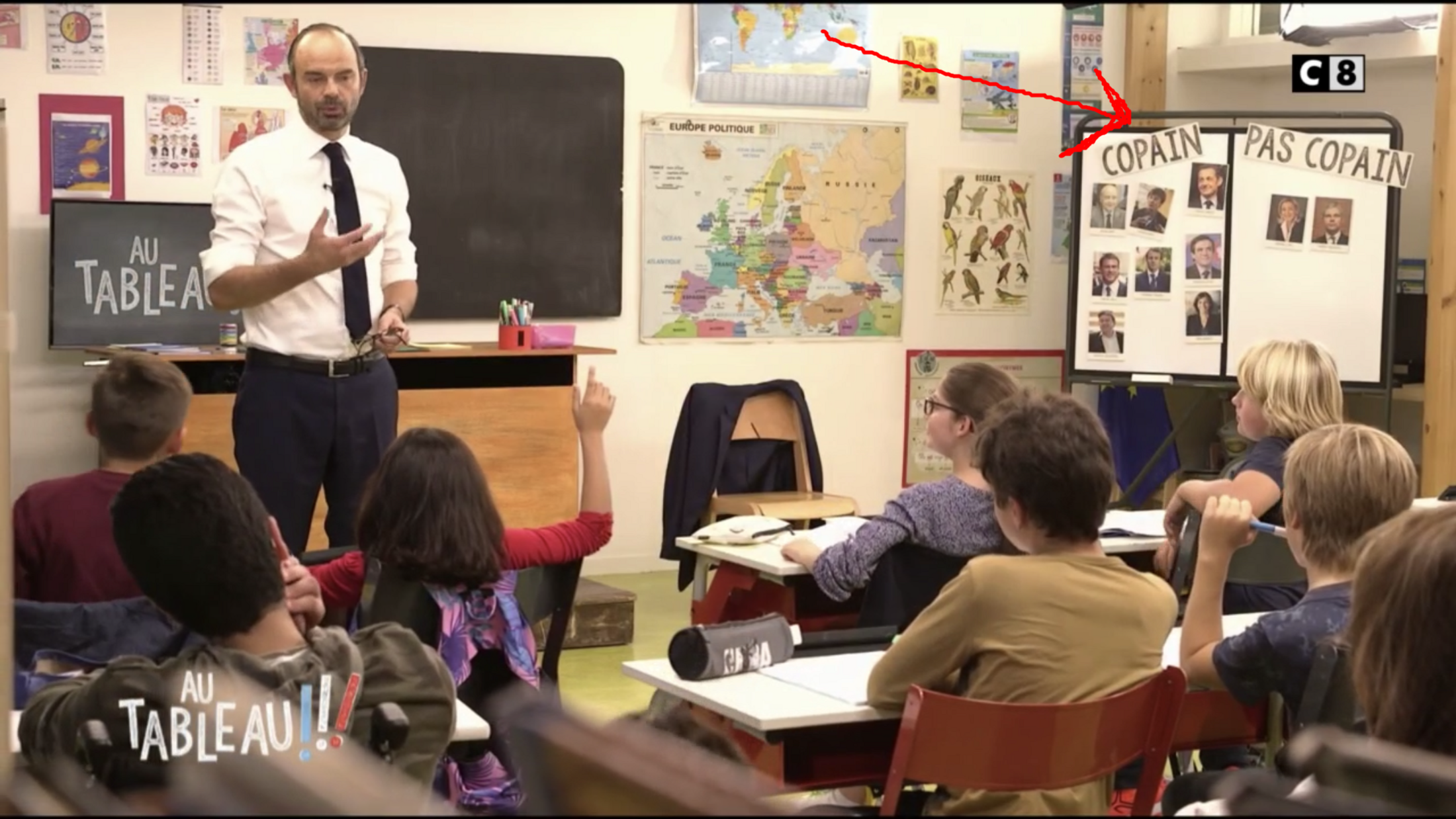 Edouard Philippe, dans l'émission Au tableau ! sur C8 le 7 février au soir, ne s'est pas contenté de dire qu'à 19-20 ans il était membre du PS, ni même qu'il était incertain sur la question de la PMA ("quand je sais pas, je sais pas, et je le dis"), il a avec beaucoup de franchise répondu aux questions des jeunes de la classe. Lorsqu'ils lui ont demandé de placer des personnalités parmi ses copains et ses pas copains, il a hésité avec Sarko (il voulait le mettre entre les deux), il a indiqué qu'il n'était d'accord sur rien avec Mélenchon mais avoué qu'il pouvait avoir des échanges sympas avec lui. Par contre, il n'a pas hésité un instant pour Laurent Wauquiez (Les Républicains), le mettant le plus loin possible, dans les "pas copains", plus loin encore que Marine Le Pen.