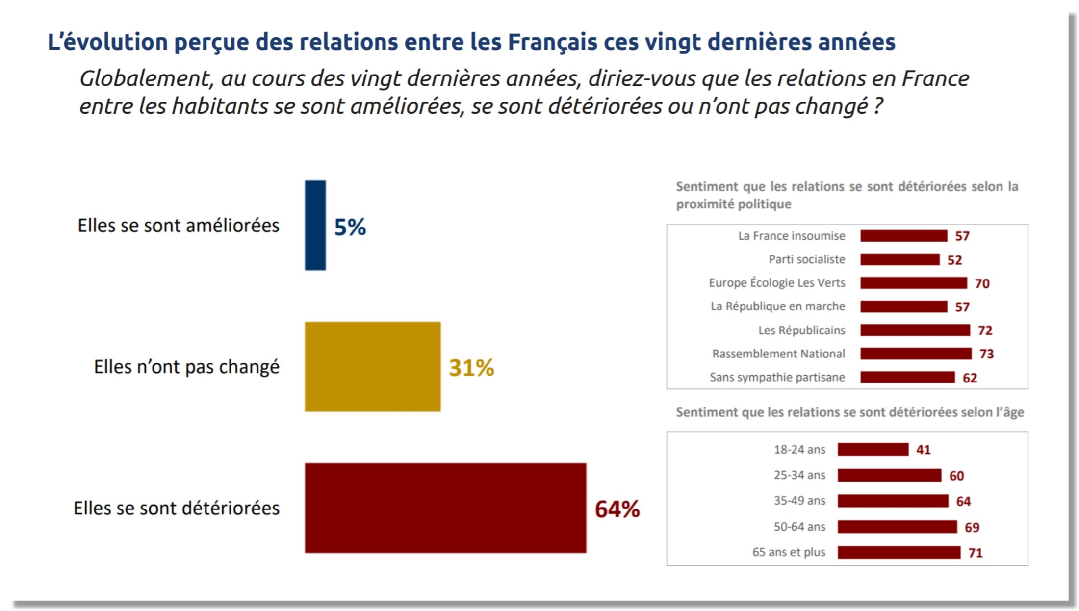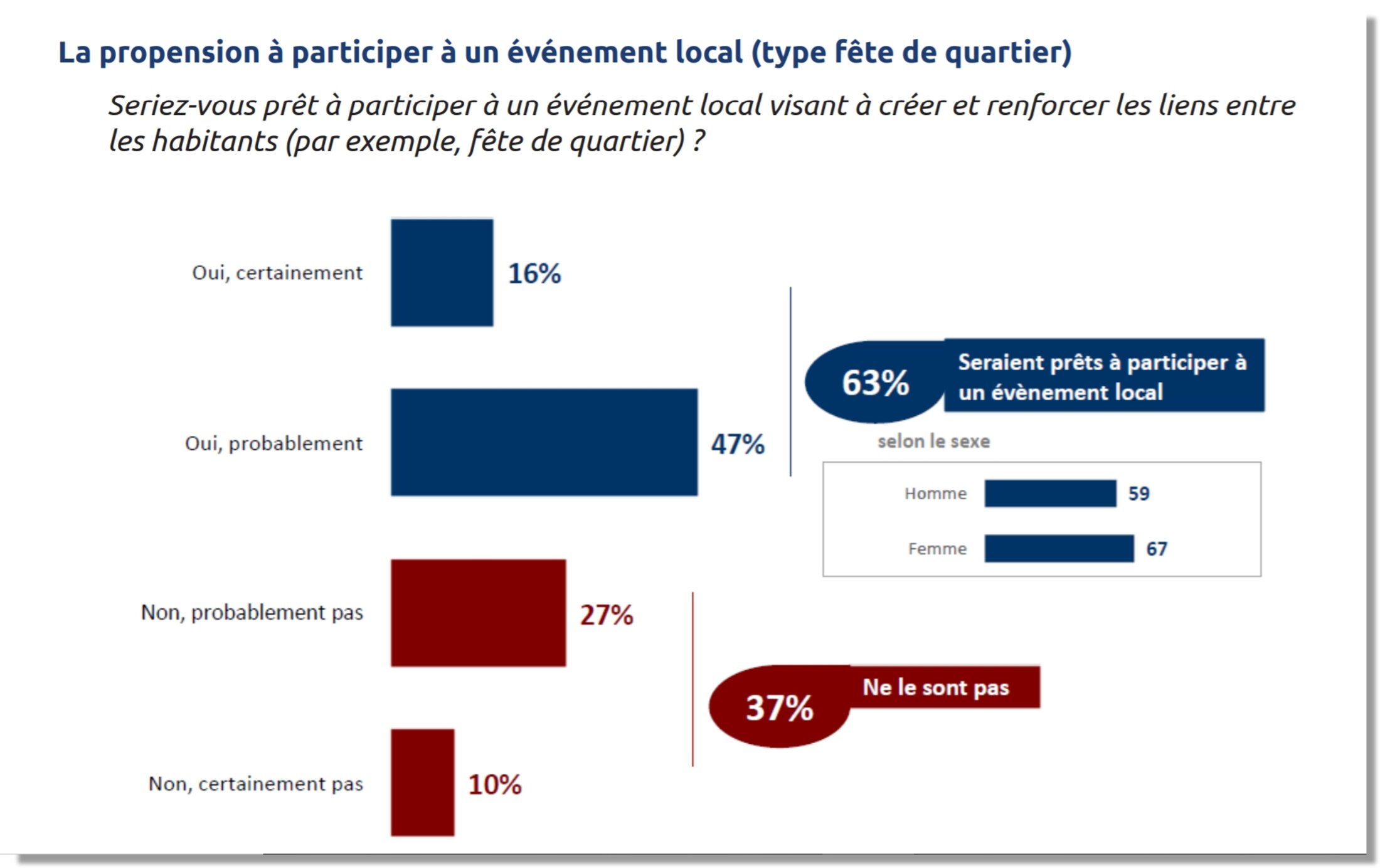 Lors de la conférence de présentation de la Journée (en visio) ce 9 septembre, auprès des journalistes et des signataires de l’Appel, Didier Lesueur, délégué général de l’ODAS, a présenté un sondage (Ifop) commandé par l’Observatoire qui confirme l’affaiblissement délétère des liens sociaux : 64 % des interrogés, autant hommes que femmes (mais surtout parmi les plus de 50 ans et en Ile-de-France) considèrent que les liens se sont détériorés au cours des 20 dernières années. Cette détérioration est constatée dans les relations entre jeunes et aînés. La crise sanitaire (selon 59 % des interrogés) a aggravé ce délitement. Cependant, 61 % des Français reconnaissent le rôle du maire pour résister à ce phénomène (surtout en Ile-de-France et dans les agglomérations de province. Et nombreux (63 %) sont celles et ceux qui se disent prêts à participer à un événement local renforçant les liens (seuls 10 % déclarent qu’ils y sont opposés).