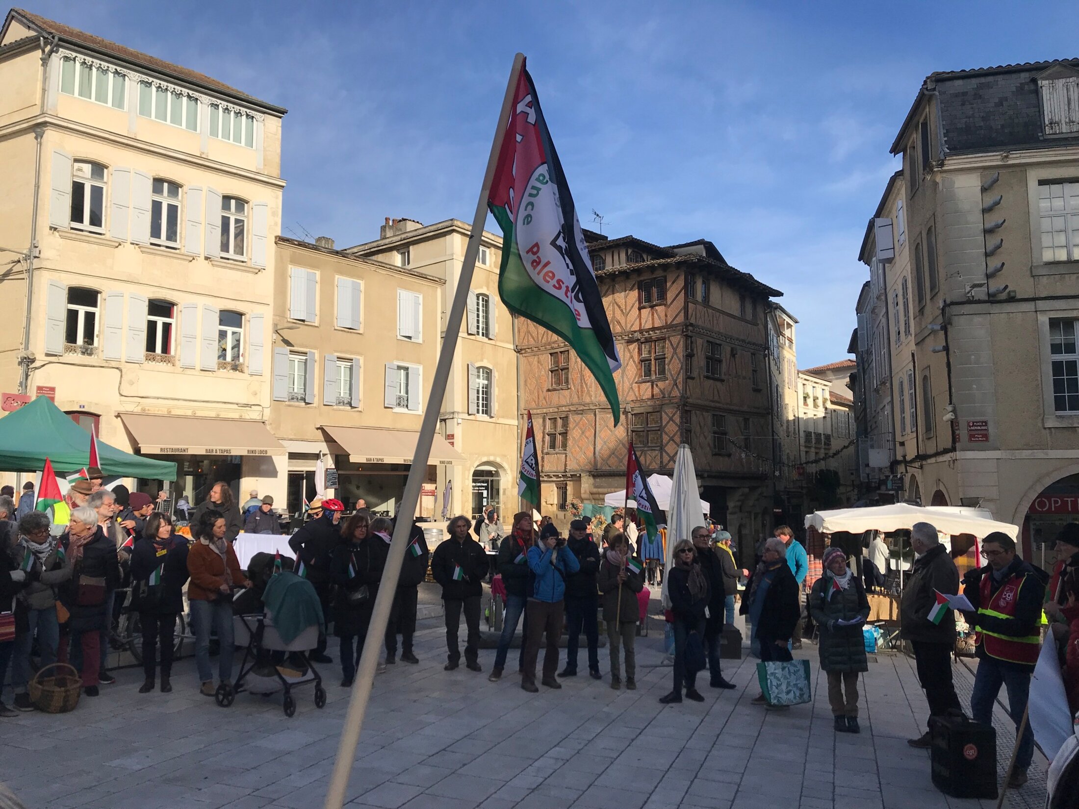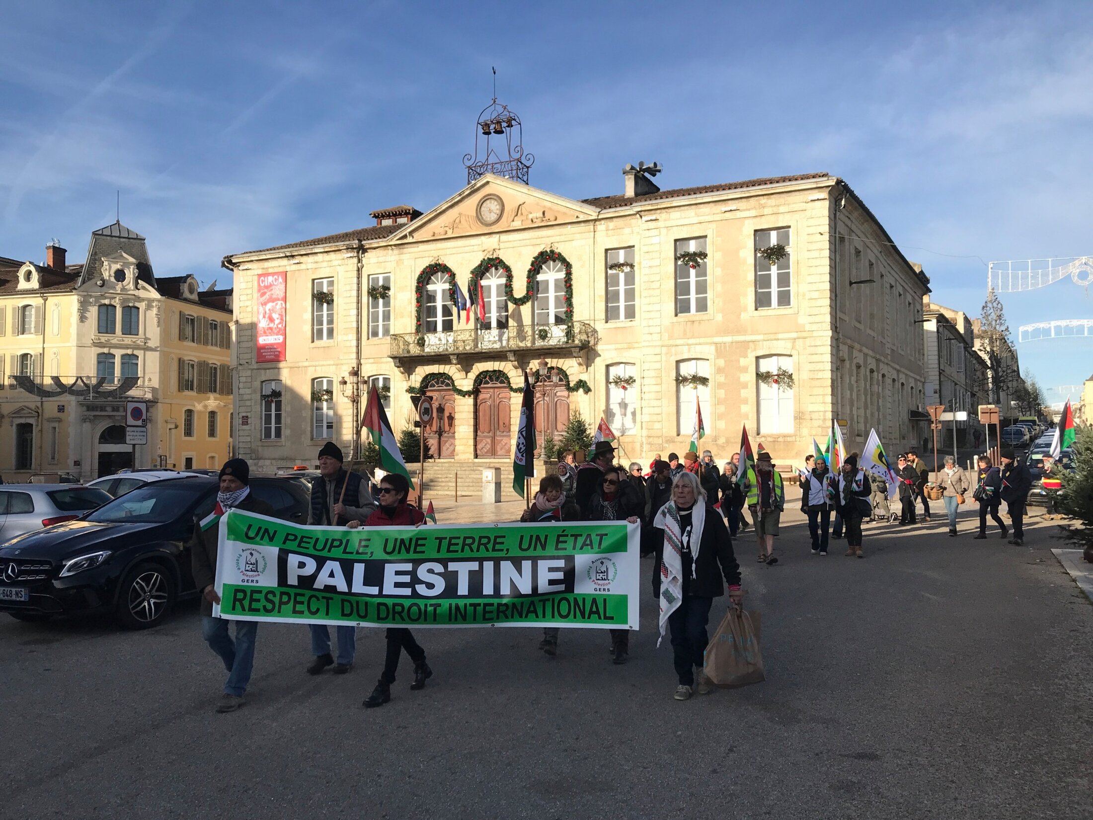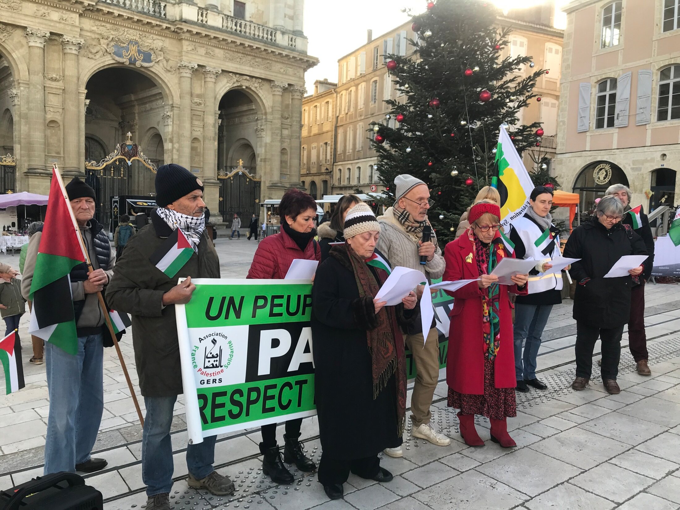 À l’occasion de la journée internationale de solidarité avec le peuple palestinien, instaurée par l’ONU, près d’une centaine de citoyens et citoyennes proclamant leur soutien aux Palestiniens écrasés à Gaza par l’armée israélienne, se sont rassemblés à Auch, dans le Gers (en Occitanie), place de la Libération le matin du 29 novembre, à l’appel du Collectif gersois pour la Paix juste et durable en Palestine (AFPS [France Palestine solidarité], LDH [Ligue des droits de l'homme], CGT, FSU, Sud-Solidaires, PCF, LFI). Puis le cortège s’est déplacé vers la place de la République (devant la cathédrale, sur le marché du samedi). Les membres du collectif ont lu chacun à leur tour un extrait d’un communiqué commun. Il est tout d’abord rappelé que cette date du 29 novembre a été choisie parce que la décision de l’ONU de partager la Palestine en deux États a été prise le 29 novembre 1947.