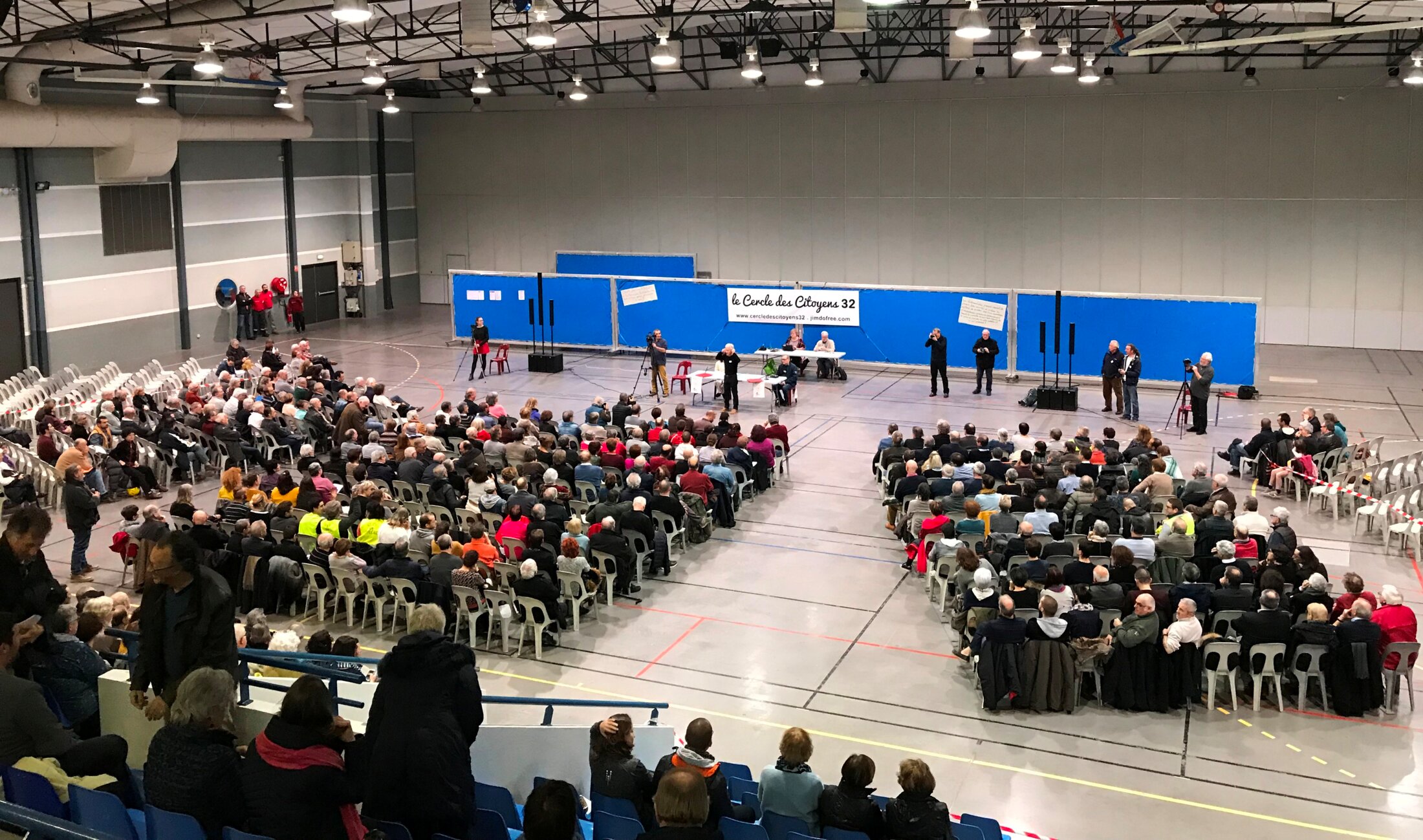 A l'initiative du Cercle des citoyens, un débat s'est tenu à Auch vendredi 8 février. Un millier de participants était attendu, ils n'étaient "que" 6 ou 700, mais une mobilisation d'une telle ampleur est rare au chef-lieu du Gers. L'organisateur, René Castagnon, ancien maire d'une petite commune, a d'emblée défini des règles strictes pour le bon déroulement de la soirée : ainsi la durée d'une prise de parole ne peut dépasser 3 minutes, sous peine de voir se dresser des panneaux rouges (méthode stricte, qui conduit à devoir s'interrompre en cours d'exposé mais qui a permis à 67 personnes de s'exprimer, 10 %, soit un taux élevé).
