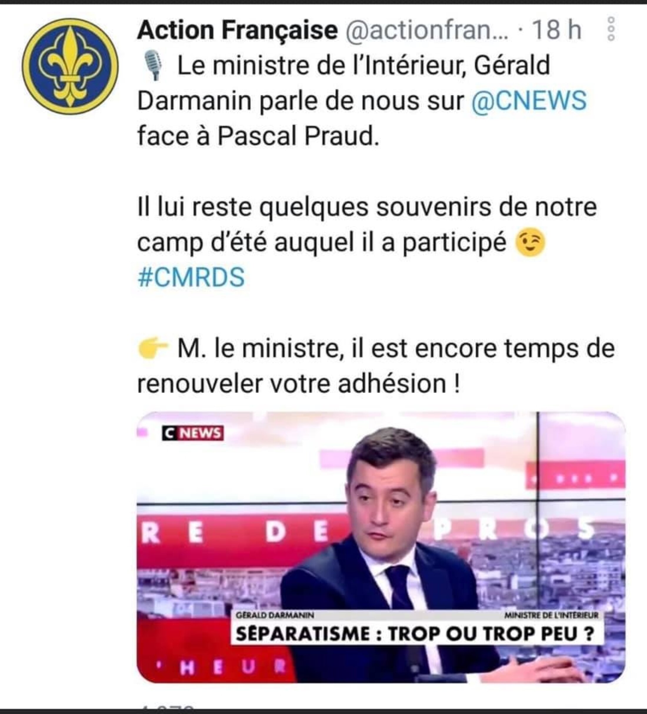Pourtant, non seulement le ministre traîne déjà quelques casseroles (vie privée et déclarations racistes), mais on en voit poindre d’autres : en 2008, il a publié quelques articles pour le mensuel de la Restauration nationale, Politique Magazine, courant royaliste, ce que vient d’indiquer le canard de Marion Maréchal-LePen, L’Incorrect. Et l’Action Française rappelle que Darmanin fut un temps dans ses rangs. À deux jours du triste anniversaire de la tentative de coup d’État des fascistes à Paris, le 6 février 1934. Remember ! [4 février]