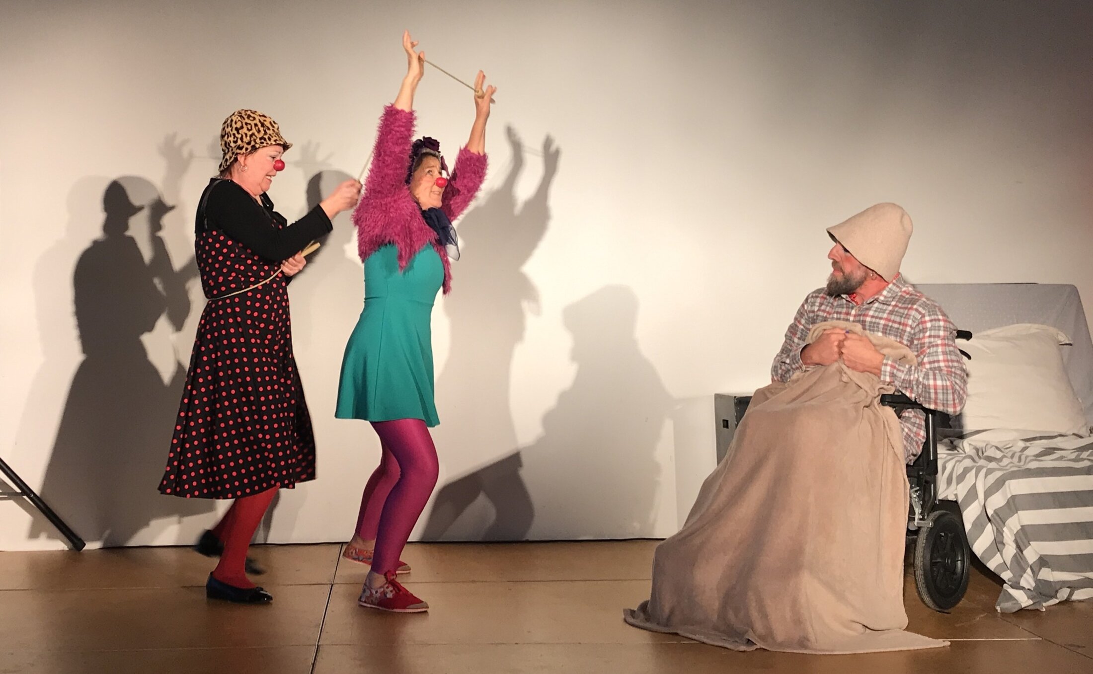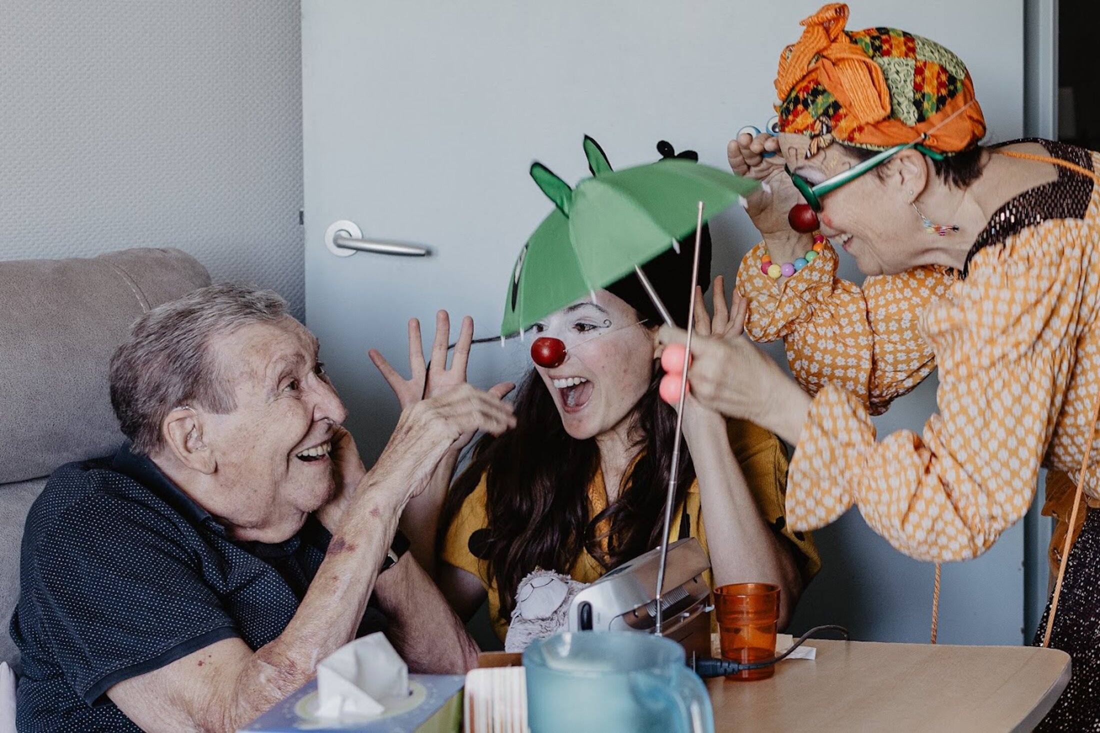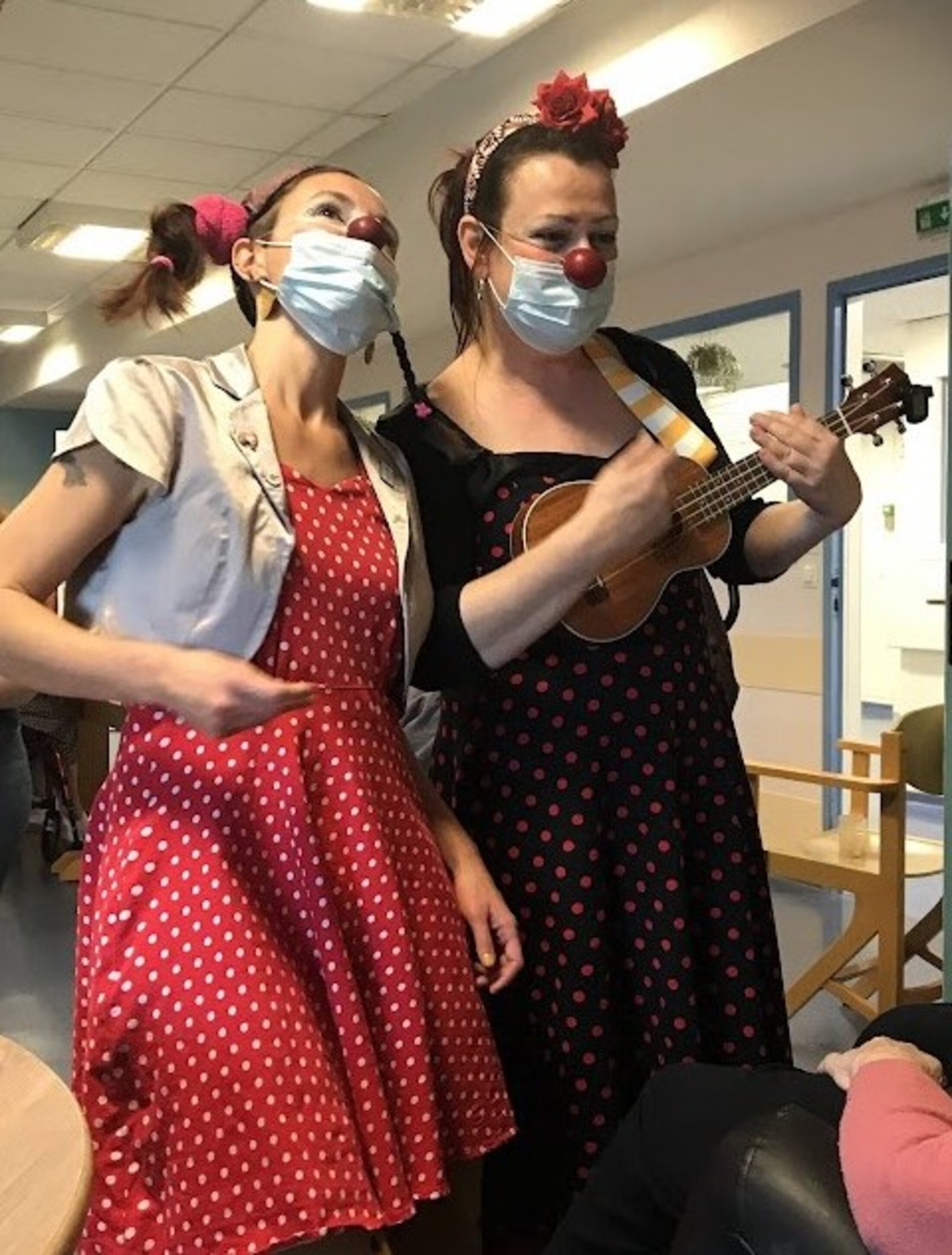 J’ai accompagné deux comédiennes clownes dans un EHPAD, Julie et Marie-Cé. Avant d’entrer dans les chambres ou dans un salon, une rencontre a lieu entre les comédiennes et une "ambassadrice", tiers institutionnel, animatrice ou psychologue référent, qui accompagnera ensuite les deux professionnelles auprès des personnes âgées. Il s’agit de faire le point sur les resident.es que les clowns connaissent pour les avoir rencontrés précédemment, lors de leurs visites bimensuelles. Comment vont-ils en ce moment, plus ouverts, plus repliés sur eux-mêmes ? Car il importe de préciser d’emblée que les clowns hospitaliers ne sont pas des comédiens présentant un spectacle pré-établi. Ils arrivent au cœur d’un établissement où il y a du mal être, de la souffrance, de la perte de mémoire, ou troubles liées à la maladie neurodégénérative (Alzheimer). Il ne s’agit pas de distraire des personnes qui s’ennuient mais de créer, grâce à une relation avec la personne, un lien pour entrer en interaction quelle qu’elle soit, verbale ou non verbale, tactile ou auditive… Tout l’art est dans la capacité d’improvisation et d’ajustement.