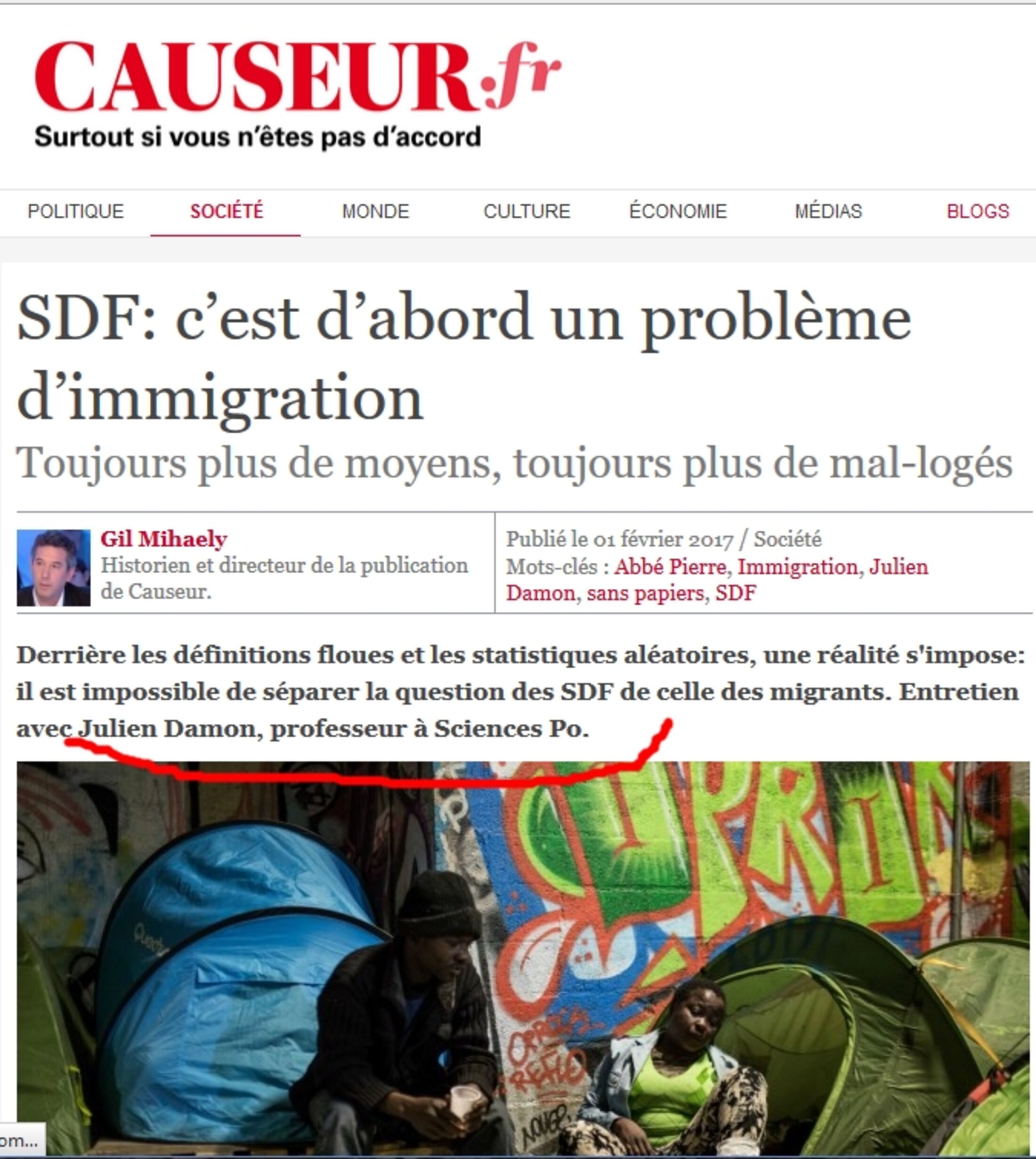 Il va de soi que la question migratoire impacte actuellement celle des sans-abri. Mais qualifier les SDF de sans-papiers n'est pas innocent, alors que les migrants non hébergés sont pour la plupart des demandeurs d'asile (donc ce ne sont pas des clandestins), ce que me confirme des travailleurs sociaux du 115. Sans parler du fait, comme la Cour des comptes le constate, que la crise économique produit de la pauvreté et du SDF. Et du SDF bien franco-français. Il est clair que cette prise de position d'un sociologue de renom satisfait pleinement la rédaction d'Elisabeth Levy dans son combat xénophobe, mais certainement pas la vérité. On peut croire que Julien Damon se soit aperçu, après-coup, de l'instrumentalisation dont il a été l'objet : car il ne cite pas cet article sur son site où pourtant il recense tout ce qu'il produit, ni sur son compte Facebook (5).