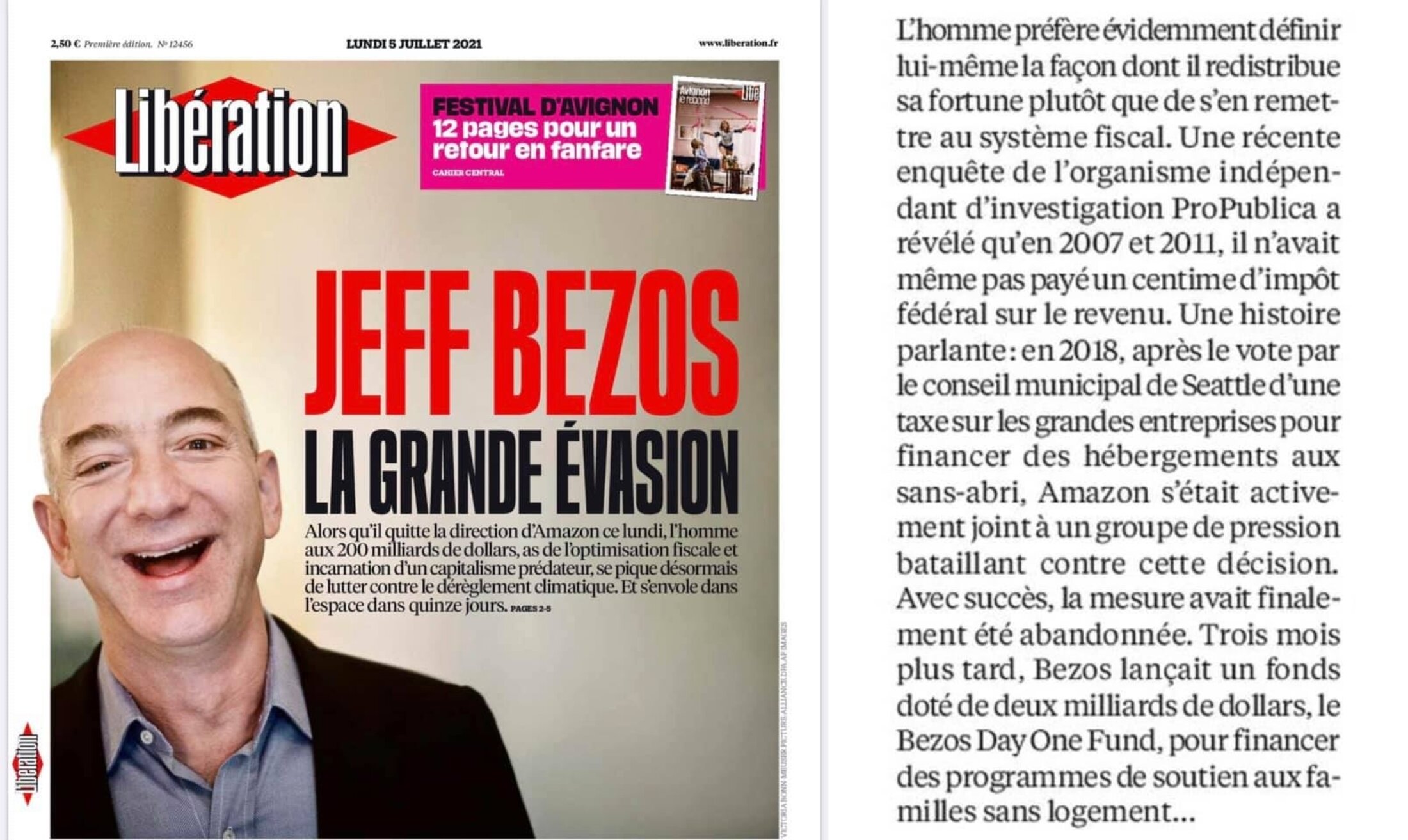 Jeff Bezos, patron d’Amazon, se prépare à se consacrer à la conquête spatiale. Il est à la tête d’une fortune de 200 milliards de dollars. Il lutte contre une taxe pour loger les SDF et sait comment ne pas payer d’impôts, quitte à être "philanthrope"… On a là un exemple emblématique de ce qu’est réellement la philanthropie. En passant : un pays qui permet à ce qu’un de ses citoyens possède une telle fortune (comme en France avec Bernard Arnaut et quelques autres) n’est pas une démocratie ni une République : rien, strictement rien ne justifie de telles fortunes. [5 juillet]