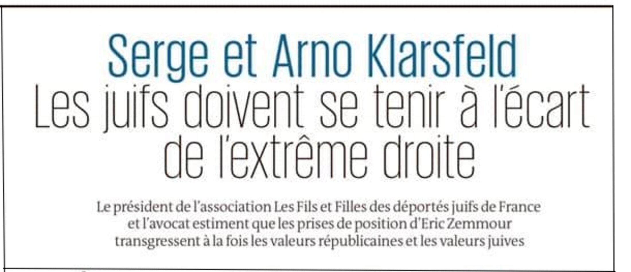Dans Le Monde de ce 13 juillet, Serge et Arno Klarsfeld se prononcent contre l’extrême droite que les Juifs ne doivent pas soutenir, condamnant ainsi Éric Zemmour, qui falsifie et manipule l’histoire en dédouanant le maréchal Pétain car il n’aurait livré aux Allemands "que" les juifs étrangers [ainsi que leurs enfants nés en France donc français, concourant ainsi à la destruction d’un quart des Juifs de France].