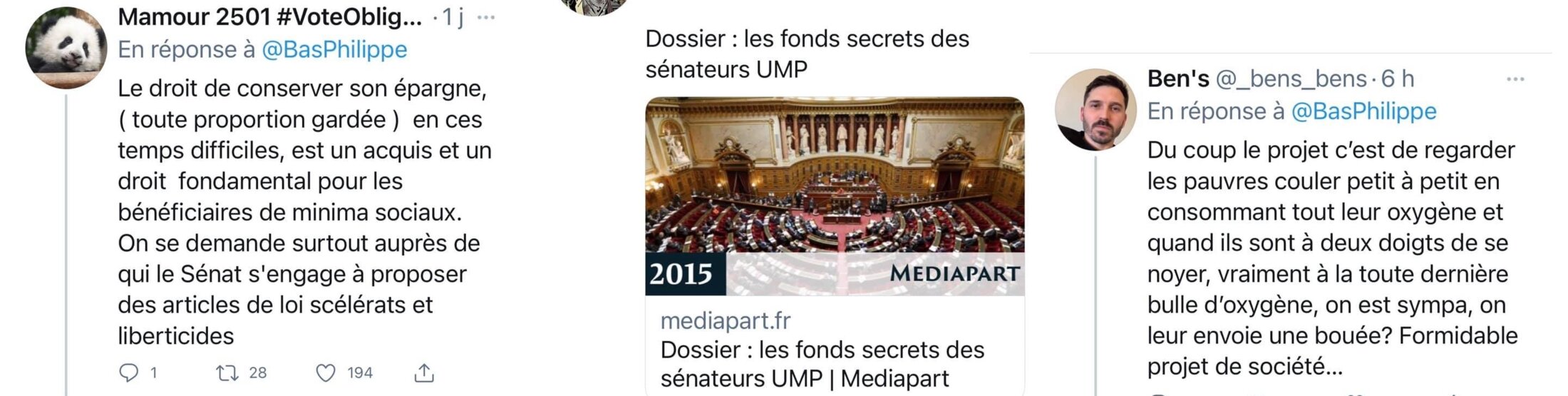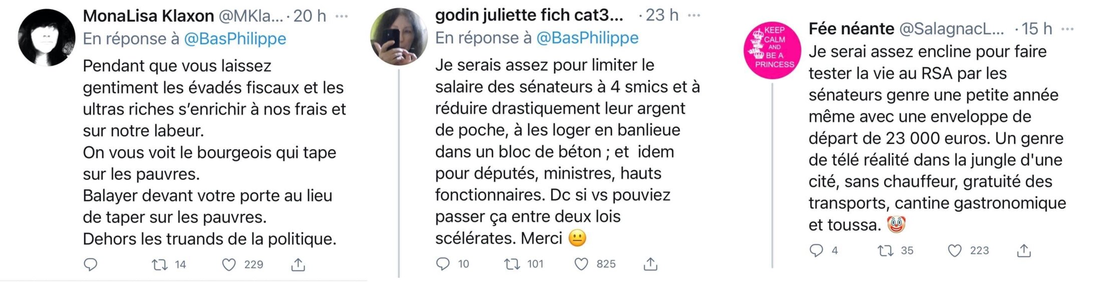 J’imaginais que les commentaires à son tweet victorieux serait suivi d’un déversement de propos haineux à l’encontre des "assistés". Que nenni : très peu de commentaires l’approuvant, plus de 90 % le désavouant et alignant des arguments : j’en publie quelques-uns. La plupart sont massivement approuvés par d’autres internautes. Plutôt réconfortant.
