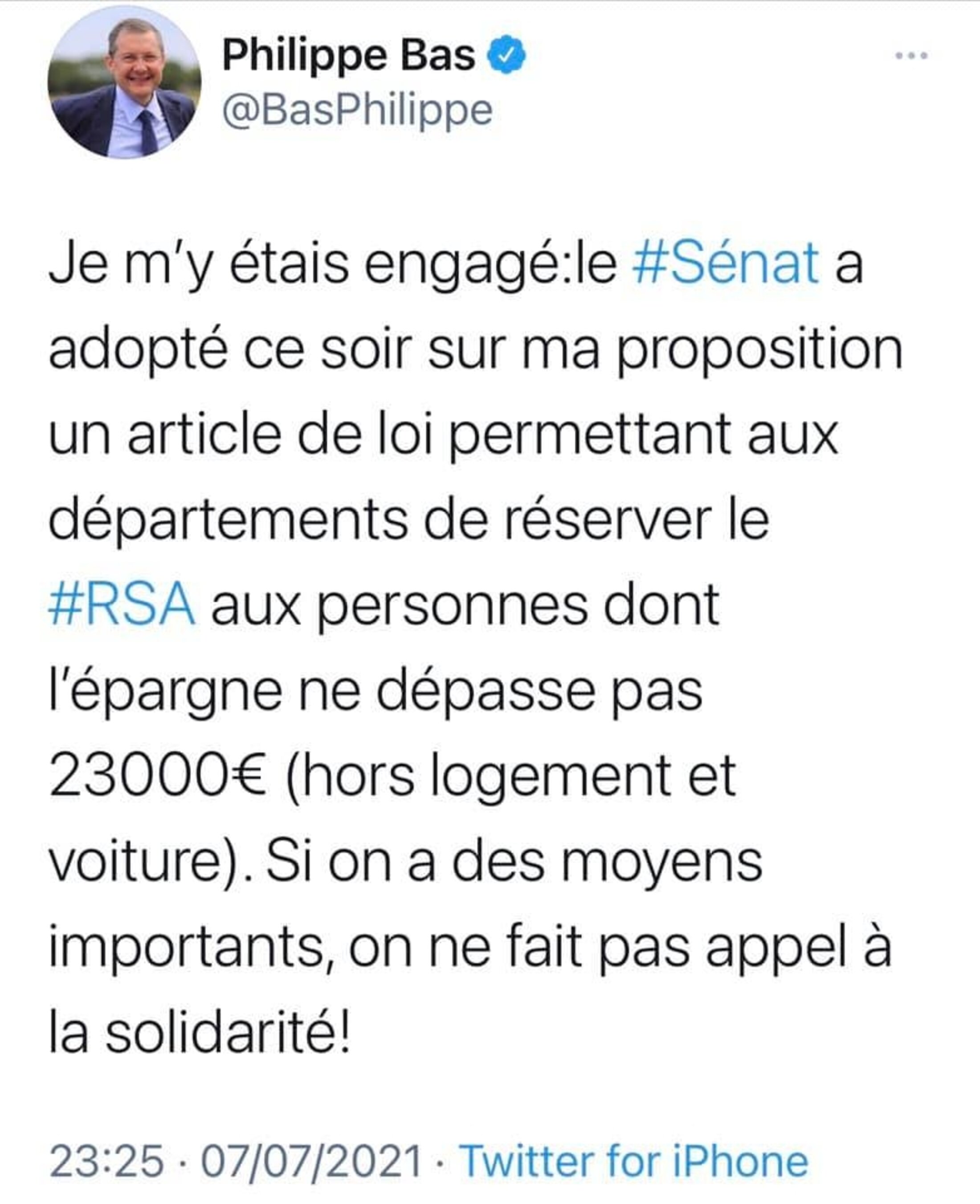 Le sénateur LR Philippe Bas se vante d’avoir fait passer un texte permettant de refuser le RSA à une personne ayant une épargne de 23000 euros. Il cherche en général à se montrer comme un élu respectueux de la loi (il a présidé la commission sénatoriale sur l’affaire Benalla et n’a pas été tendre avec le pouvoir, sachant que cela faisait les affaires de la droite LR). Là, il ratisse sur les terres RN. Très peu de gens au RSA ont une telle épargne mais un tel affichage laisse entendre qu’ils seraient nombreux : c’est tout bon. Et Monsieur Bas ne sait rien des rares allocataires du RSA ayant cette épargne.