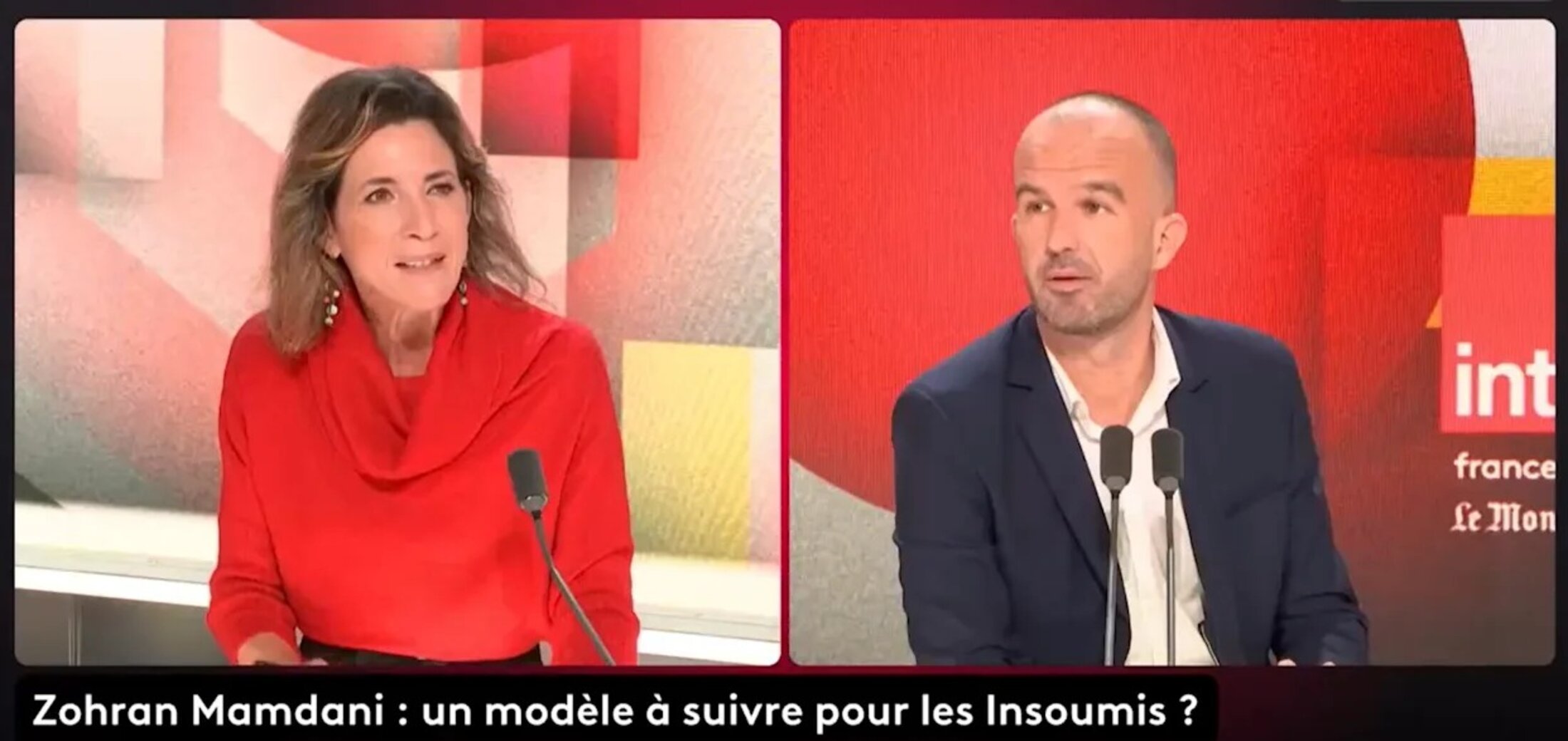 Dimanche 9 novembre, il était sur France inter (Questions politiques), interrogé par Alexandra Bensaïd (France Inter), Alix Bouilhaguet (France télévision), et François Fressoz (Le Monde). Il faudrait rendre compte de l’ensemble de l’interview mais je vais faire court. Alexandra Bensaïd dit constater que Zohran Mamdani le nouveau maire de New York est la « nouvelle icône » de LFI puis Alix Bouilhaguet s’étonne de cette proximité car le nouveau maire soutient l’UNRWA, l’agence de l’ONU chargée de venir en aide aux Palestiniens, qu’elle accuse d’avoir des liens avec le Hamas. Ce que Bompard dément. Elle met également en cause Zohran Mamdani pour n’avoir pas condamné le 7-octobre, d’avoir appelé à « faire la guerre aux Juifs partout dans le monde » (ce que signifierait selon elle un slogan « mondialiser les intifadas »), ce que Bompard dément également, précisant que Mamdani n’a jamais défendu ce slogan, qui, par ailleurs, ne signifie pas ce qu’elle en conclut. Choqué, il déclare qu’elle devrait être là « pour informer les gens, pas pour les désinformer ».