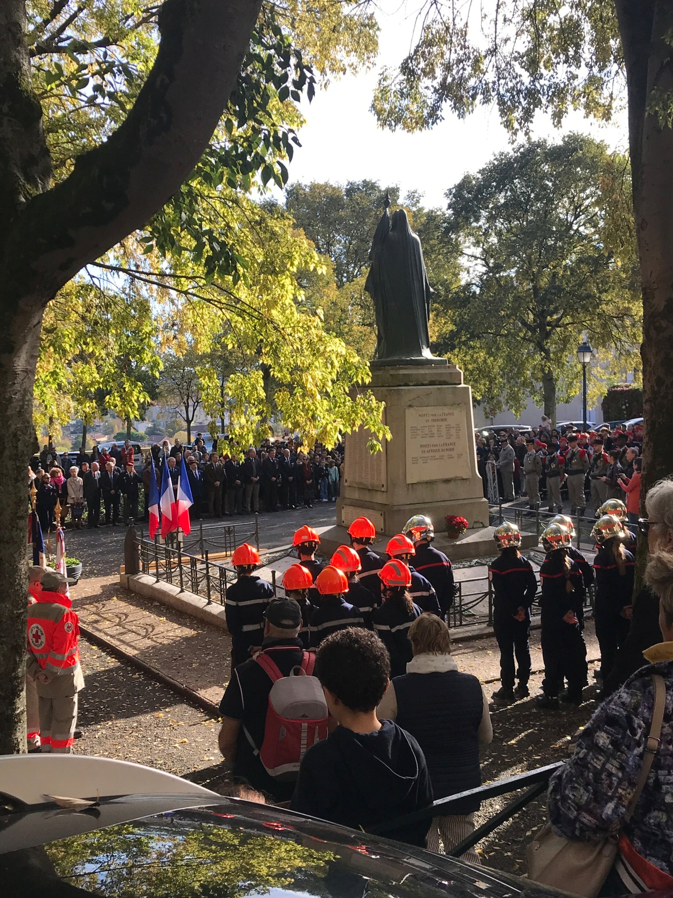 Ce matin [11 novembre], la commémoration de l’armistice de la guerre de 14-18 a rassemblé beaucoup de monde devant le monument aux morts, à Auch (Gers) comme partout ailleurs en France, y compris dans les villages. 200 à 300 personnes, y compris un détachement d’un régiment, des jeunes pompiers et des jeunes du Service National Universel, dépôts de gerbes par des politiques accompagnés d’écoliers. Cette année, contrairement à l’an dernier, pas de décoration pour des militaires ayant maté une manifestation ou ayant combattu en Indochine ou en Algérie, mais honneur au régiment présent dont les faits d’armes, dans le passé, se sont déroulés sur des théâtres coloniaux d’opération.