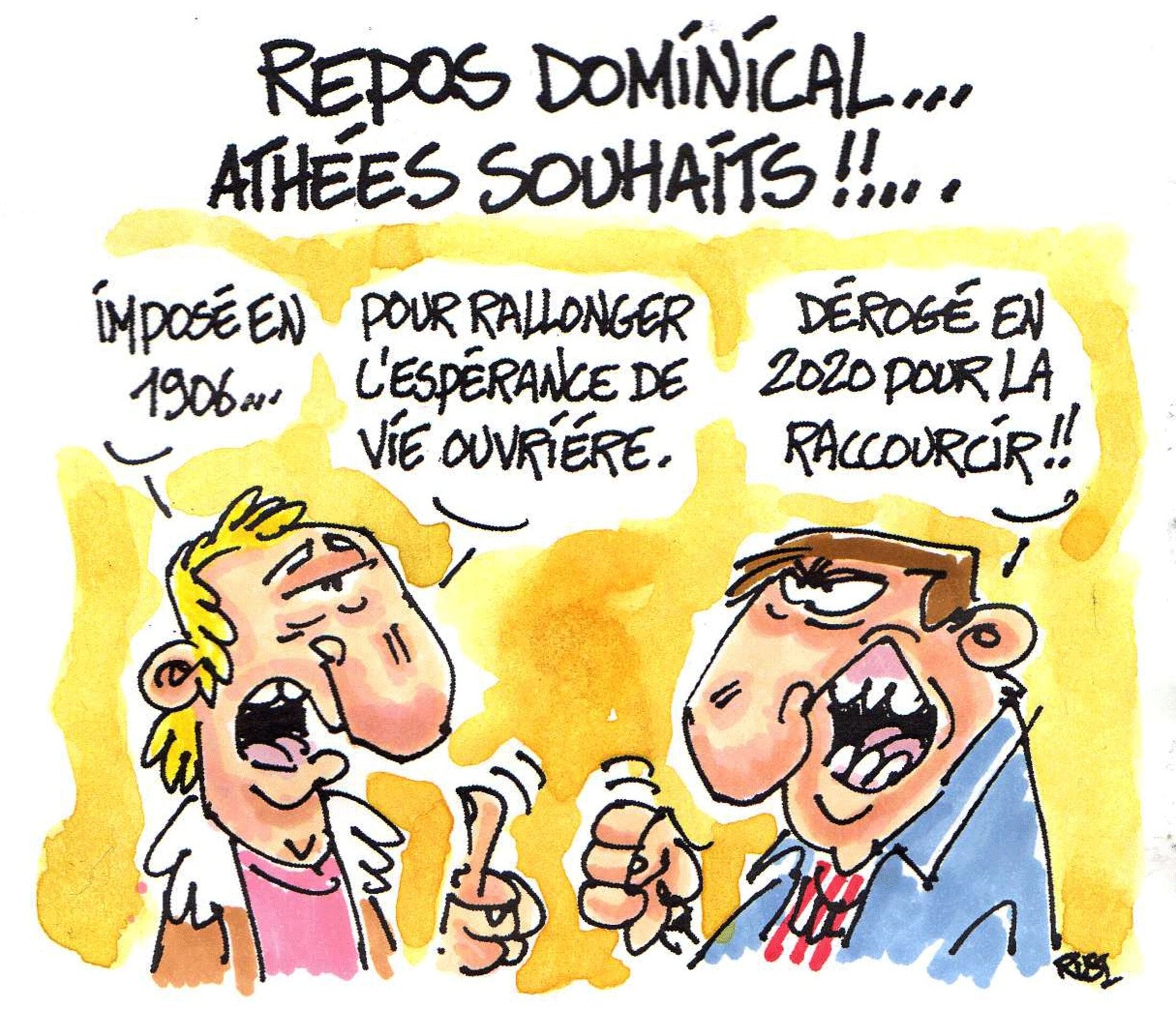 Par contre, le repos dominical (du dimanche) était jusqu’alors récupéré dans les établissements religieux, comme pour tout salarié hors de la liste. On me signale qu’un décret du 28 janvier (aucun média ne s’en est fait l’écho à cette heure) prévoit que les « établissements à caractère religieux » puissent déroger à titre permanent au repos dominical. Il aura donc fallu attendre janvier 2022 pour que les salariés bossant dans des institutions religieuses ne puissent plus bénéficier d’une majoration pour travail le dimanche. [31 janvier] ici