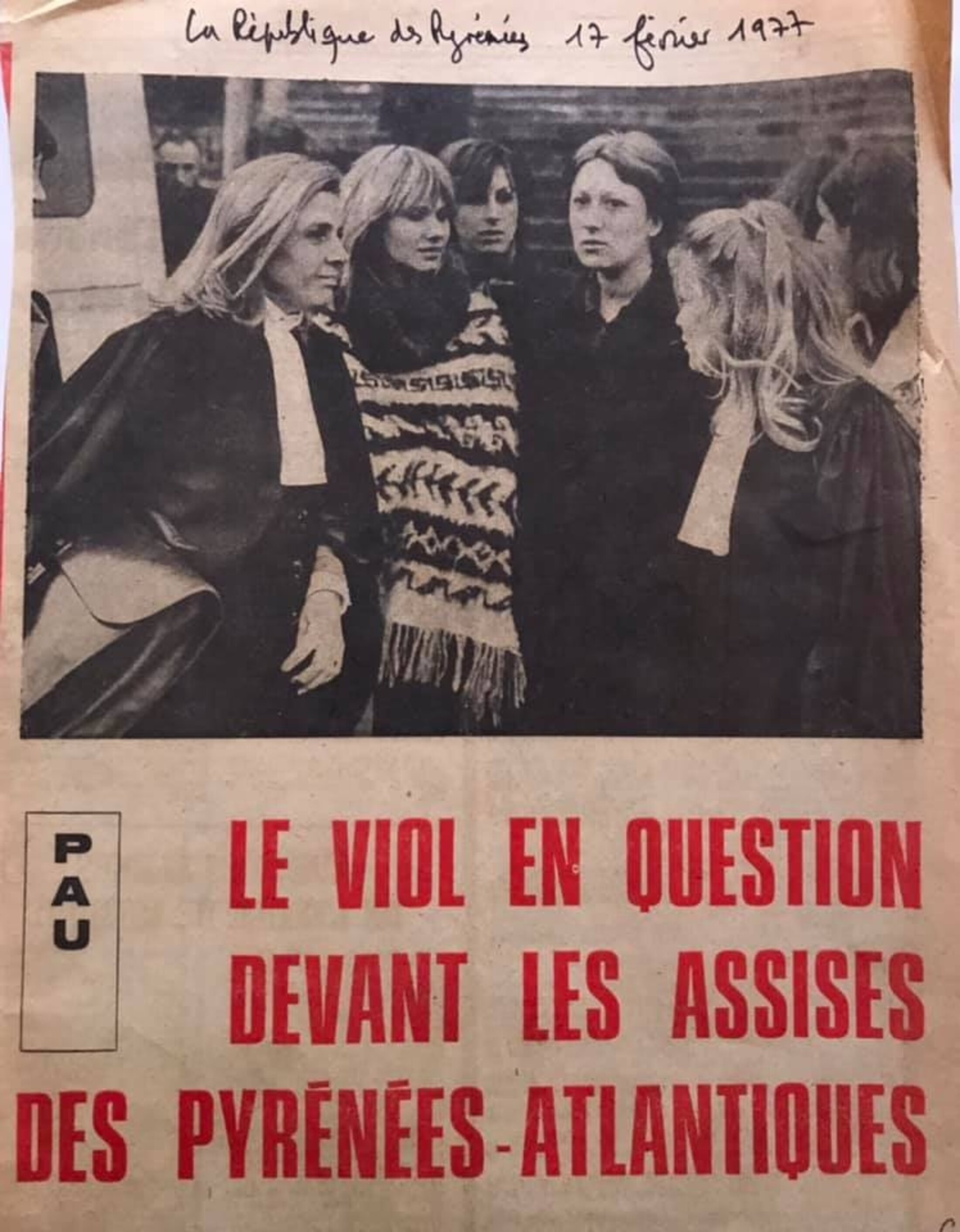 Occasion pour moi de livrer un témoignage : en février 1977, j’assiste à Pau à un Congrès des Santé-Sociaux de la CFDT (confédération qui à l’époque défendait l’autogestion). Au même moment, a lieu un procès pour viol aux Assises des Pyrénées-Atlantiques : une jeune femme a été violée par quatre individus (deux jeunes majeurs et deux mineurs), à Laruns, dans le Béarn. L’avocate de la victime est également Gisèle Halimi. Une manifestation a lieu, à laquelle participe tout le congrès syndical (300 personnes) : nous défilons au cri de « Non au viol » (La République des Pyrénées du 17/02/1977*). Du coup 700 personnes investissent le Palais de Justice. Les coupables sont condamnés à 4 et 2 ans de prison ferme et les mineurs à 2 ans et 1 an de prison ferme. Pas très cher payé, certes, mais, déjà en ce temps-là, ils étaient bien poursuivis pour crime.