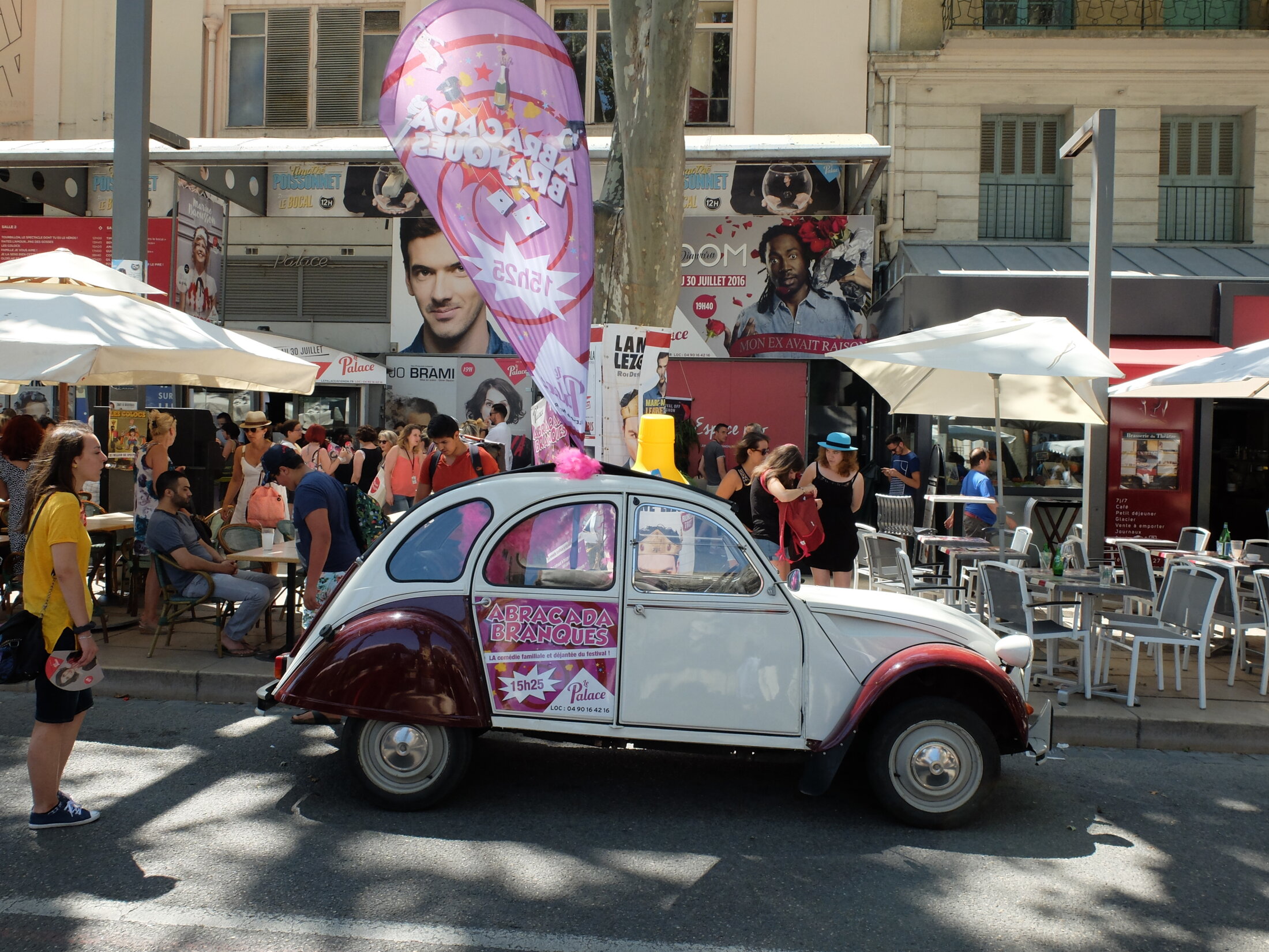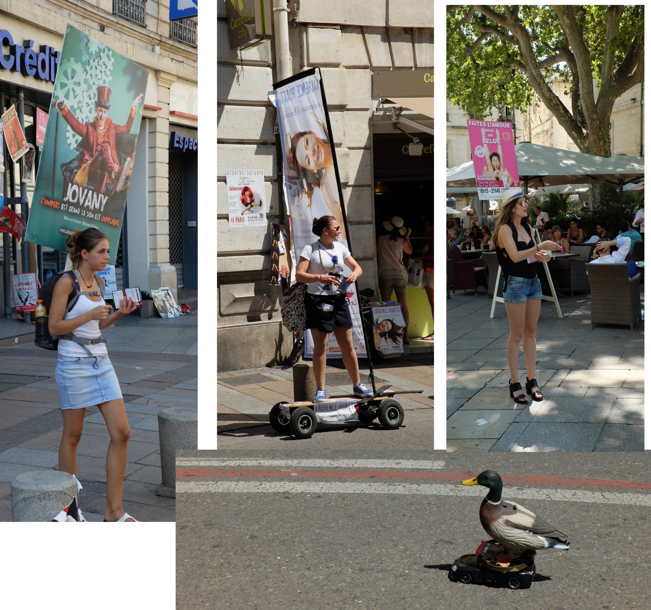 Dans un spectacle au magasin Théâtre, Yannick Bourdelle rend hommage à Robert Lamoureux : sous prétexte que ce dernier a joué la Chasse aux canards, on a droit dans l'avenue centrale d'Avignon à un canard juché sur une petite voiture téléguidée ! Ce qui compte avant tout c'est d'attirer l'attention, en étant si possible original.