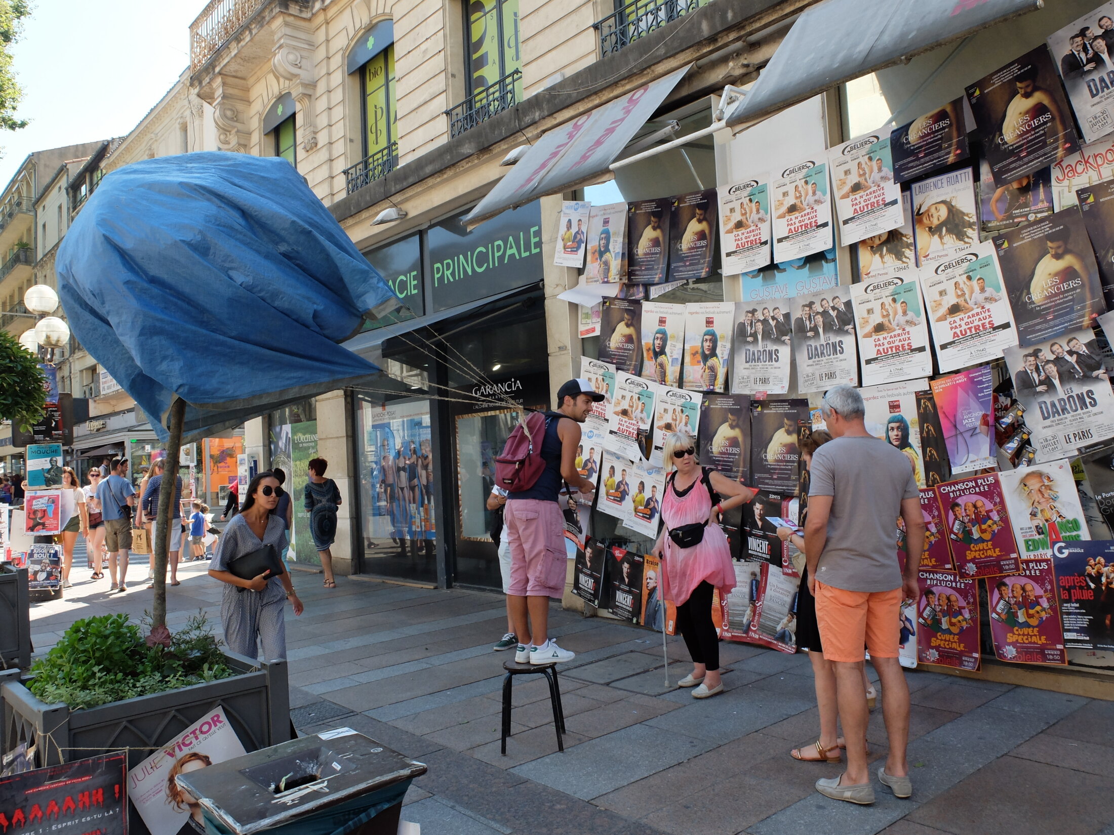 Si le "in" exit, le "off" continue : une véritable orgie avec 1336 spectacles ! Tout l'art est de se faire connaître quitte à enfourcher une multitude de stratagèmes : homme ou femme sandwich ; Edgar, qui raconte l'histoire d'un enfant de 10 ans annonçant à ses parents qu'il veut devenir danseur classique, se montre en personne dans la rue, en passant sa tête dans un trou de son affiche.