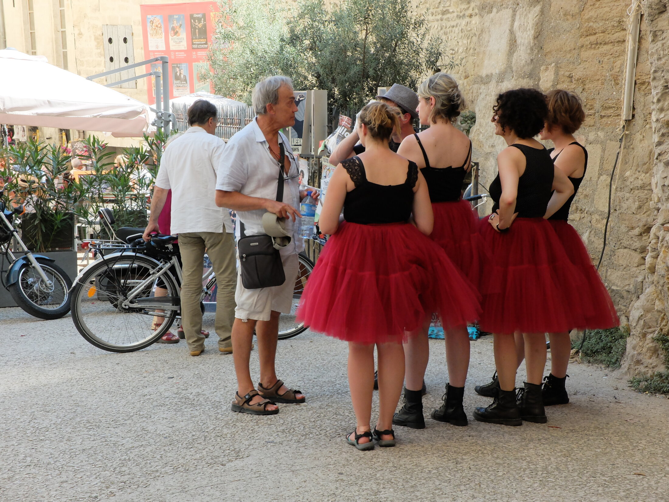 Nora Hamzawi fait la retape sur le trottoir. Momento, avec sa valise, appelle le public à venir le voir jouer Elastic. Les Filles du Nord, qui interprètent Le cirque des femmes, palabrent devant le théâtre du Verbe fou en tenue de scène.
