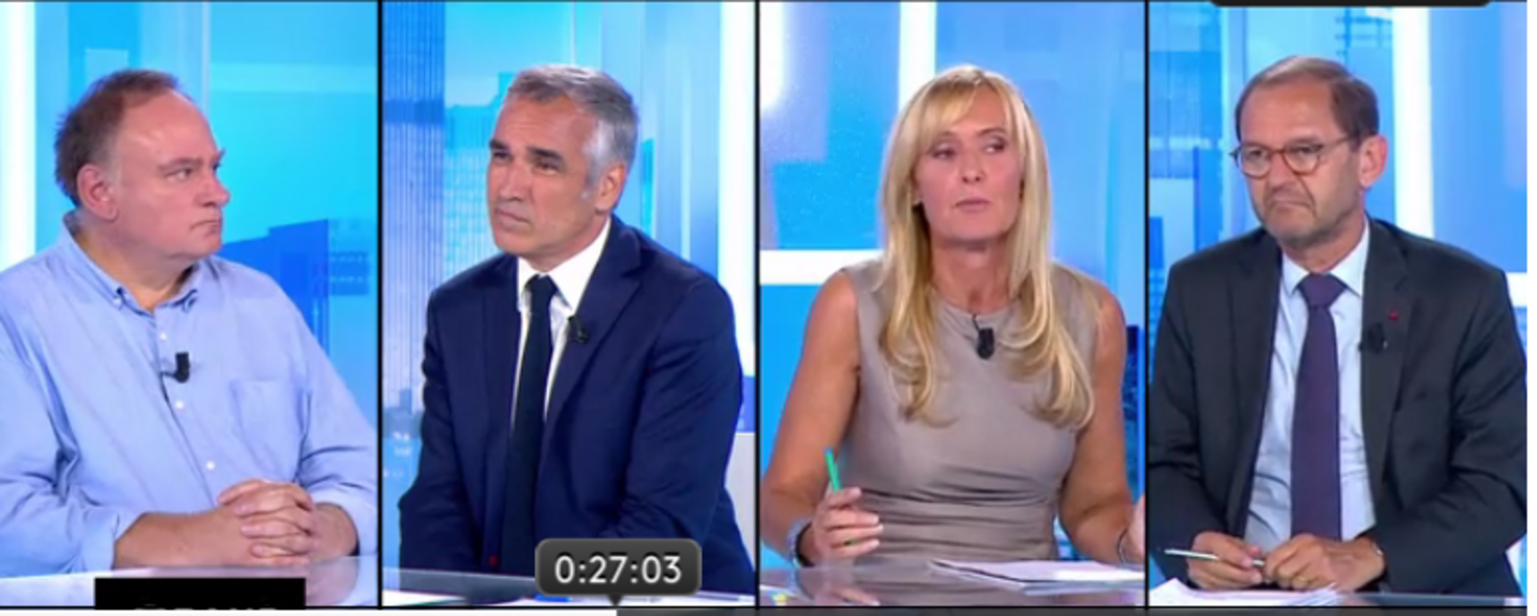 . Lors de l'émission du 25 août, les libéraux sont là, mais leurs propos sont plus mesurés : ils ont en face d'eux Thomas Porcher, membre des Économistes atterrés, co-auteur avec Frédéric Farah d'un petit ouvrage fort bien fait Introduction "inquiète" à la macron-économie (Les Petits matins, 2017). A C dans l'air, Porcher s'applique à rappeler la proximité entre Hollande et Macron, et qu'il est sans intérêt de les opposer. Il exprime son "inquiétude" quant aux leçons qui n'ont pas été tirées de la crise de 2008, avec crainte de replonger dans une même crise financière : dividendes qui augmentent sans retenue, investissements qui ne sont pas faits. Une politique macro-économique aurait favorisé la croissance, mais l'Europe a fait le choix de l'austérité. La croissance que l'on voit poindre (1,5, peut-être 2, en 2017) il faut qu'elle profite à tous, qu'elle soit "inclusive", et non pas uniquement réservée à la sphère financière. Si le gouvernement mettait le paquet sur la rénovation des logements (économie d'énergie), ce serait : créateur d'emplois, facteur de croissance et générateur de recettes fiscales. Par ailleurs, la loi travail joue sur l'éternel principe de "compétitivité", attitude frileuse, qui néglige totalement l'innovation, et la montée en gamme : talon d'Achille de l'industrie française, qui préfère causer "marché du travail".