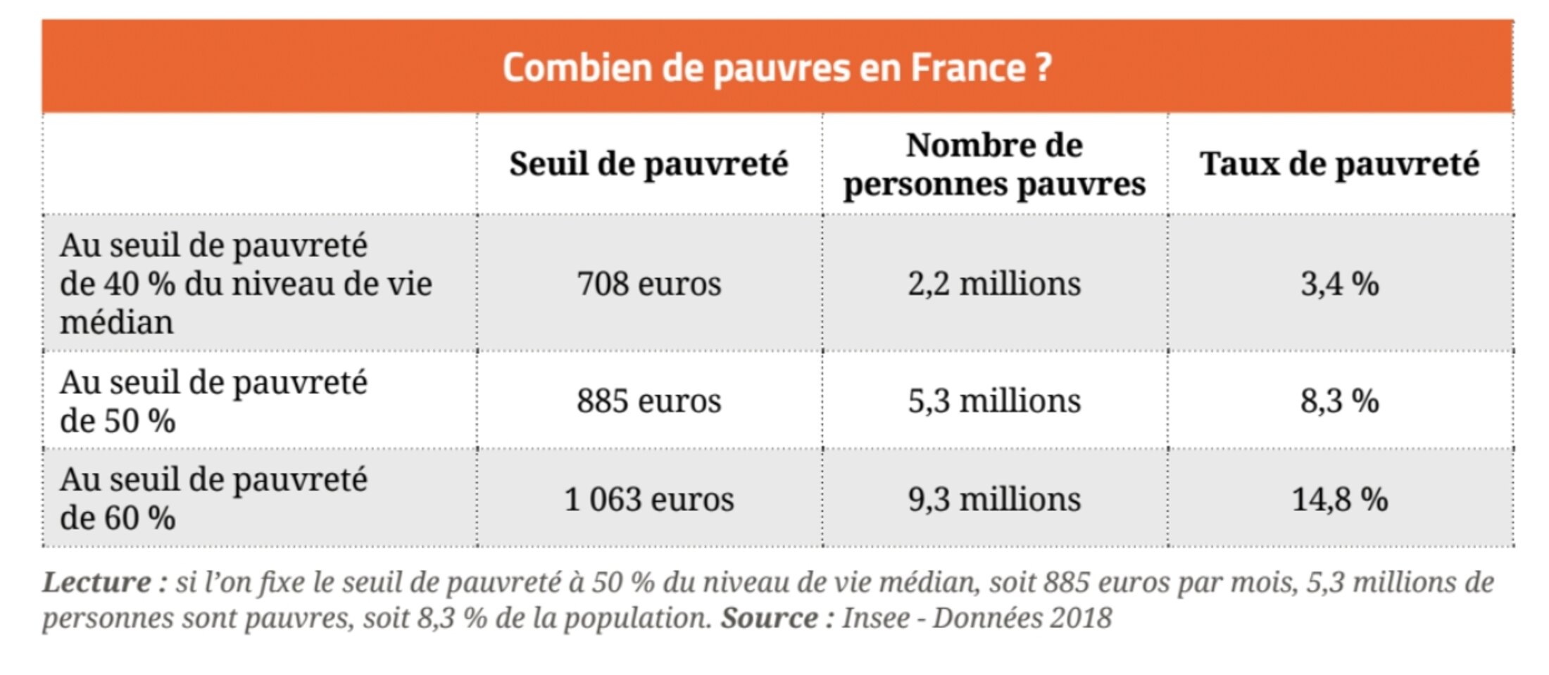 « La France reste l’un des meilleurs modèles sociaux au monde qui protège mieux les pauvres que la plupart des autres pays riches », mais en France on reste pauvre plus longtemps. Emmanuel Macron avait fait la promesse, en 2018, d’éradiquer la pauvreté. Certes, il y a eu les mesures « Gilets jaunes », la baisse de la taxe d’habitation et la hausse de certains minima sociaux : minimum vieillesse (ASPA) et allocation adulte handicapé (AAH). Mais l’effort national doit être d’autant plus grand que la baisse du chômage, quand elle advient, ne suffit pas : en effet, quand le chômage progresse, la pauvreté s’accroît (c’est évident), mais quand le chômage baisse la pauvreté ne se réduit pas dans les mêmes proportions. Pour différentes raisons : en général, les plus qualifiés retrouvent du travail, tandis que ceux qui ont moins de chance de trouver un emploi, soit acceptent des emplois précaires, peu rémunérés, à temps partiel, restant de fait sous le seuil de pauvreté ou, au terme de leurs droits à indemnisation, basculent dans les minima sociaux. Ainsi, les allocataires de minima sociaux ne cessent d’augmenter : 1,9 millions de foyers au RSA, 1,2 avec AAH, 570 000 à l’ASPA, 380 000 avec l’ASS (l’allocation de solidarité spécifique, fin de droits au chômage), 200 000 autres (invalides, demandeurs d’asile ou chômeurs âgés) soit 4,25 millions de foyers (2018) ce qui représente avec conjoints et enfants 6,9 millions de personnes (10 % de la population de la France). Sans parler de l’ensemble des ménages qui perçoivent une allocation logement, la CMU, le chèque-énergie (prestations perçues pas seulement par les minima sociaux).