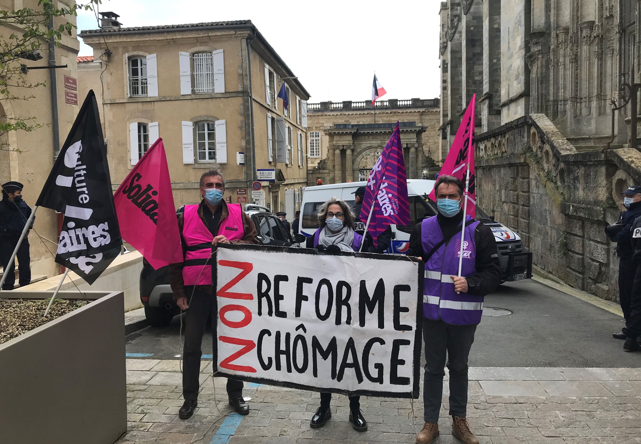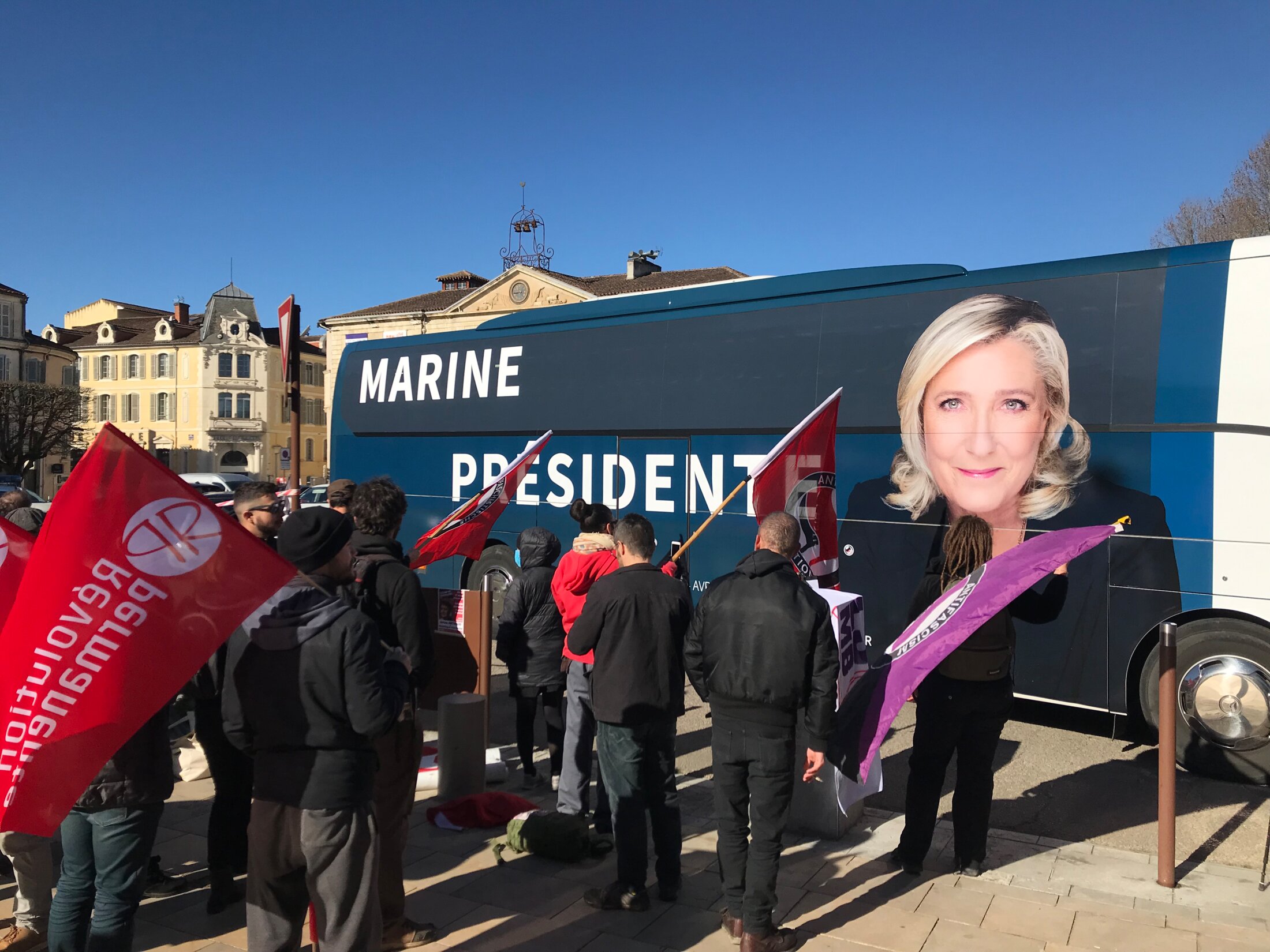 L’"Assemblée spontanée de défense sociale" avait appelé dimanche soir à un rassemblement devant la mairie d’Auch (Gers, Occitanie) un peu avant l’annonce des résultats. Une quarantaine de personnes venues protester contre le dilemme surréaliste auquel le pays est soumis : n’avoir au second tour d’une élection présidentielle que le choix entre une droite dite "libérale" qui défend les intérêts des possédants et une extrême droite qui a le culot de prétendre faire du social alors que son nationalisme exacerbé et sa xénophobie viscérale laissent entrevoir des lendemains saignants. Aucun des participants ne désirait la victoire d’Emmanuel Macron, encore moins celle de Marine Le Pen. L’absurdité de la situation empêchait d’espérer une faible victoire de Macron qui impliquait un fort score de Le Pen, et vice versailles : piégés sur toute la ligne. Malgré tout, le résultat annoncé à 20h. rassurait quelque peu, juste savoir que les fachos ne seraient pas au pouvoir le lendemain matin, mais résignés à devoir combattre un nouveau quinquennat d’un président élu uniquement parce que des opposants à sa politique ont été contraints à le soutenir.