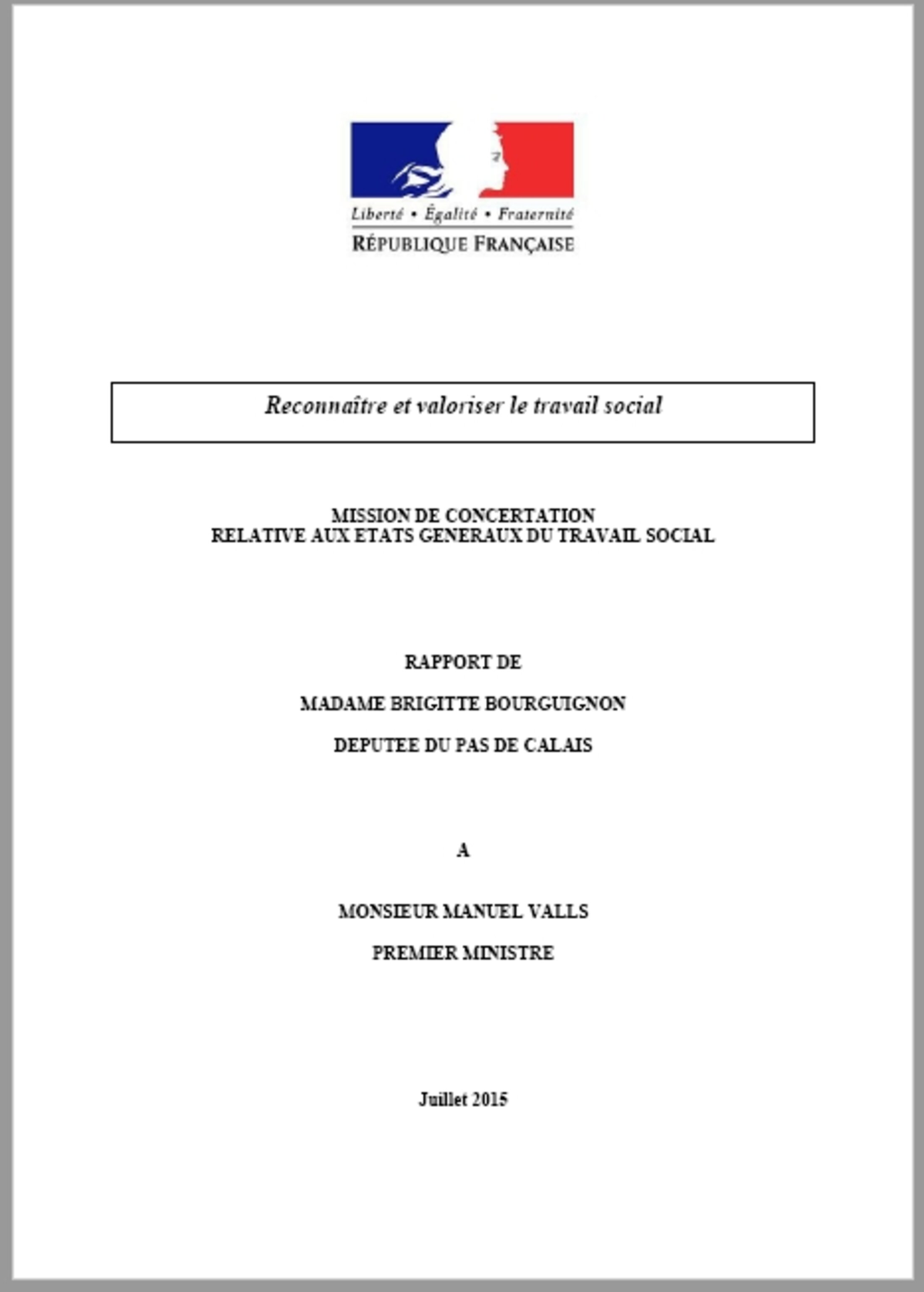 . Reconnaître et valoriser le travail social, 85 pages. Mission de concertation relative aux États Généraux du Travail Social, rapport de Madame Brigitte Bourguignon, députée du Pas-de-Calais à Monsieur Manuel Valls, Premier Ministre, juillet 2015.