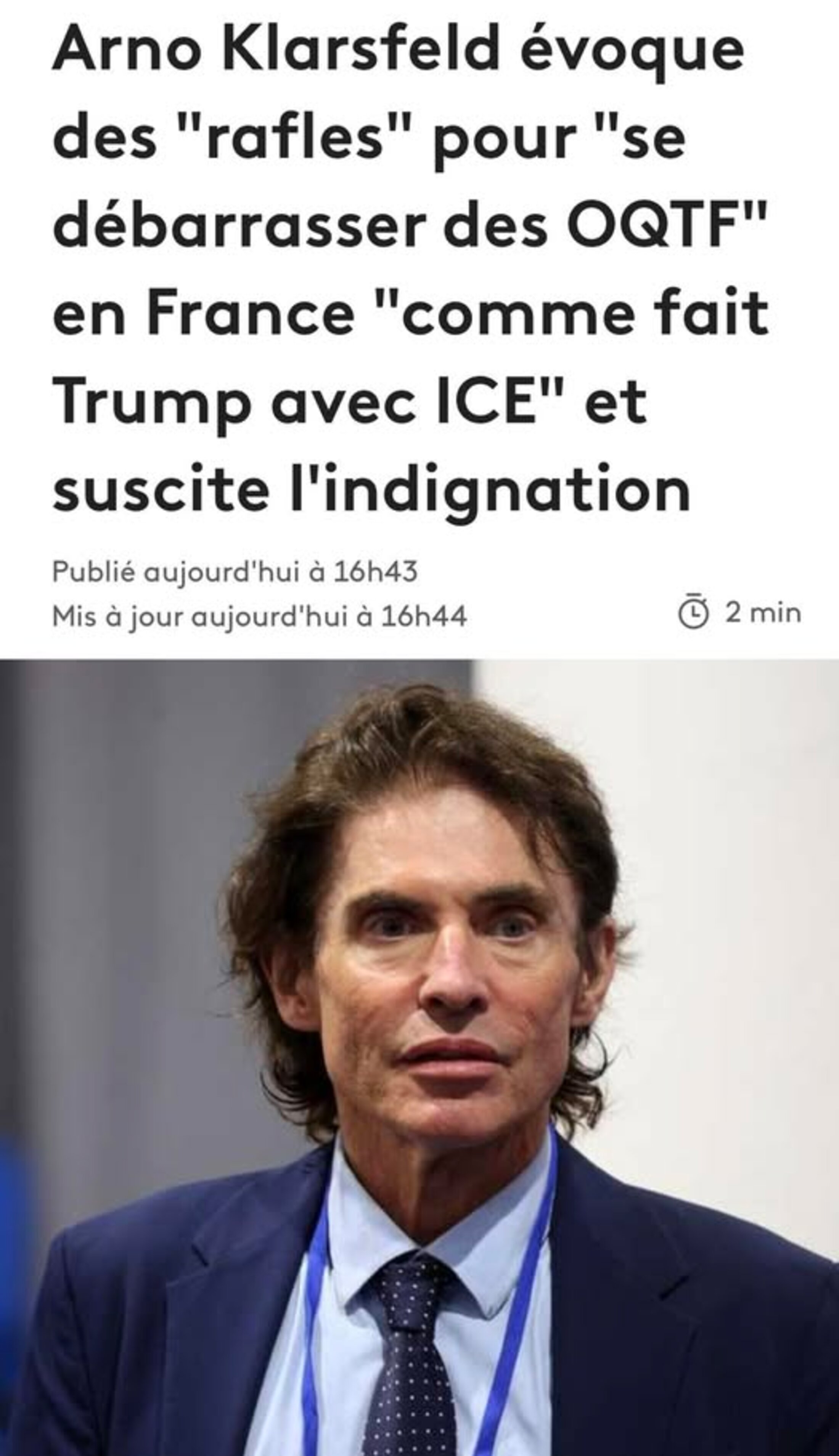 Arno Klarsfeld, avocat parait-il, nommé jadis par Nicolas Sarkozy médiateur pour les sans-papiers, promu par le même Sarkozy au Conseil d’État, puis chargé par toujours le même (Sarko, devenu mari de son ex-petite amie, Carla Bruni, et futur condamné à 5 ans de prison, pour trafic avec un État terroriste), de la présidence de l’Office français de l’immigration et de l’intégration (OFII), chroniqueur raciste, vantant la politique d’Israël, sans jamais un mot sur le massacre des Palestiniens (lui l’ancien soldat de Tsahal), donnant souvent l’impression d’avoir fumé la moquette, sur la chaîne d’extrême-droite CNews (et sur LCI), appelle à effectuer des rafles contre les sans-papiers ayant fait l’objet d’une OQTF. Participant avec les racistes de CNews à l’idée fausse que faire l’objet d’une OQTF c’est être délinquant.