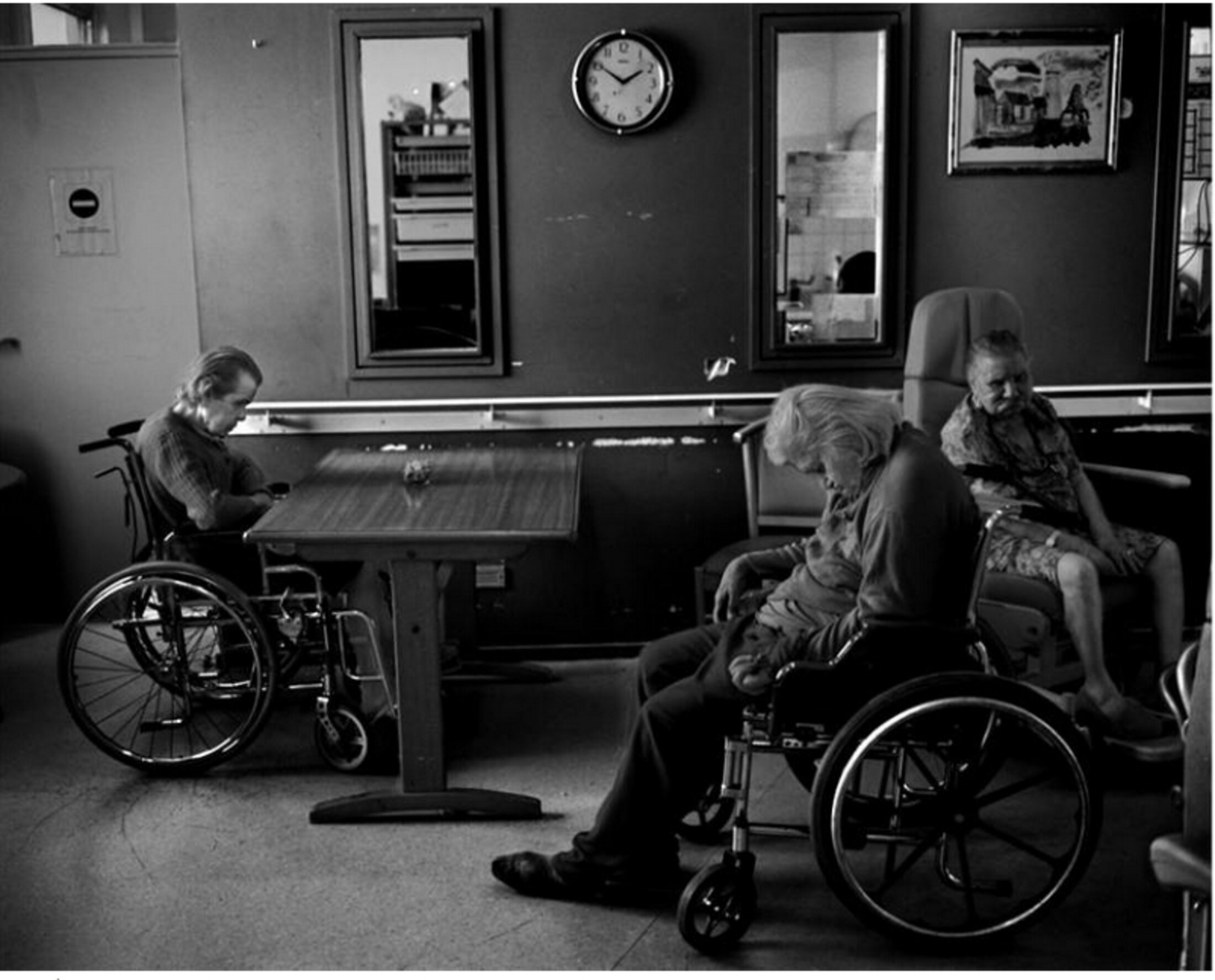 . Le temps immobile des services "Alzheimer", photographies de Hervé Baudat, 25 février 2015, remis en ligne sur Mediapart ce 30 janvier. Hervé Baudat photographie depuis des années le quotidien de services d’hôpitaux qui accueillent des patients présentant une « maladie d’Alzheimer ou apparentée ». Malgré trois plans nationaux mis en place depuis 2001 pour les soigner, peu de choses changent.