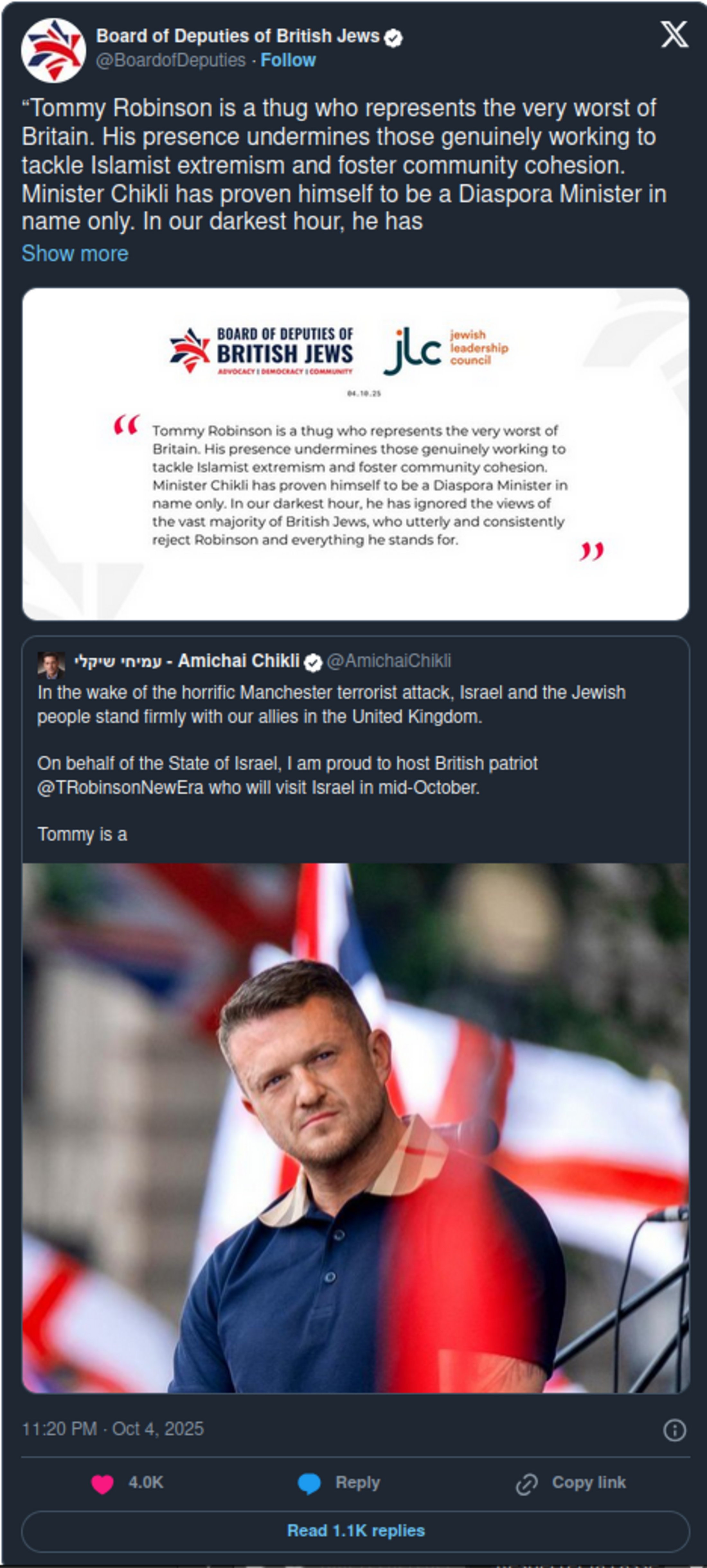 En réponse à l'invitation de Chikli sur X, Robinson a écrit : « L'horrible attentat de Manchester a renforcé ma conviction que le Royaume-Uni et Israël mènent le même combat, contre le fléau du djihad islamique. Leur combat est notre combat. »