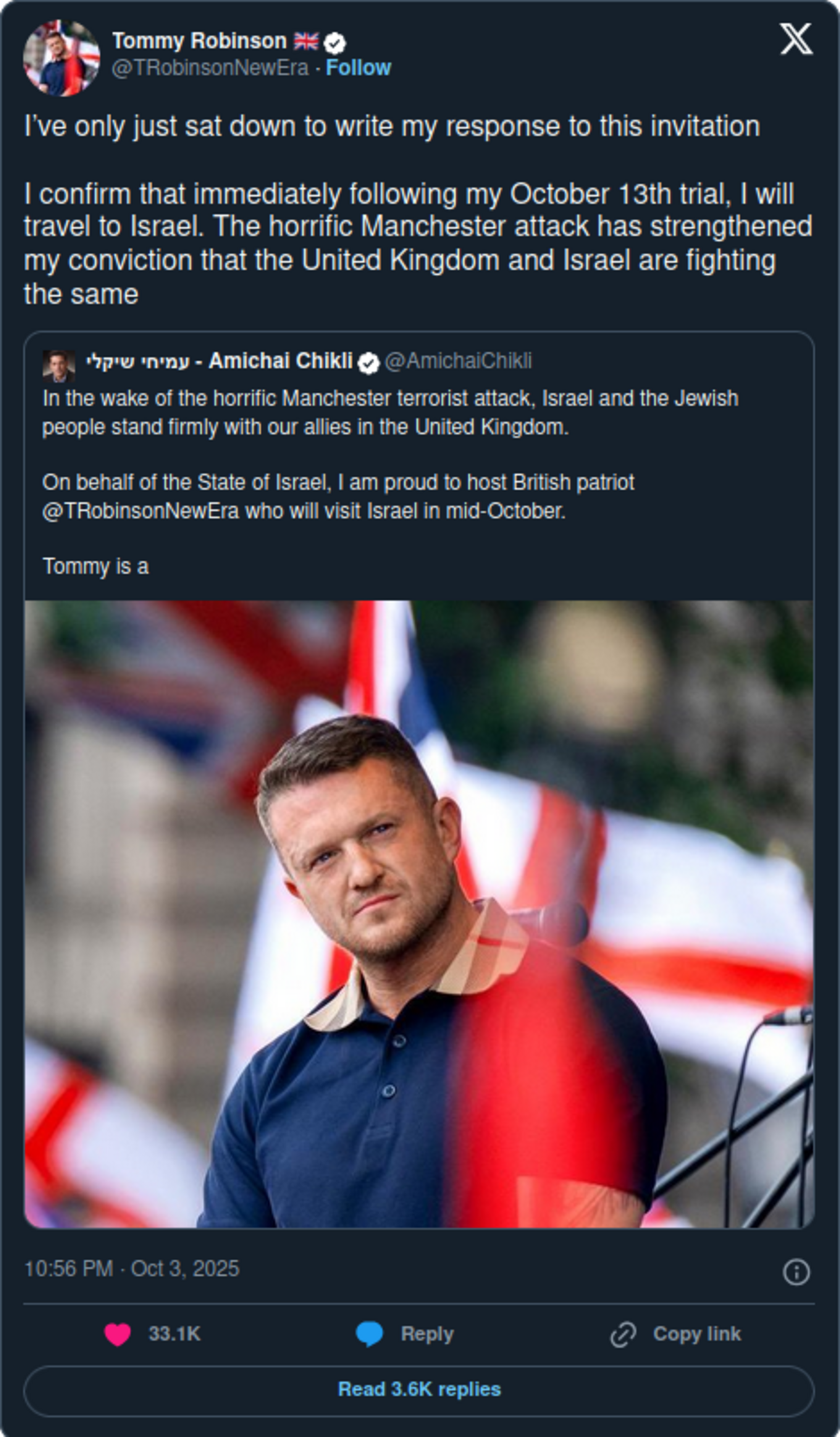 Chikli a annoncé vendredi que Robinson se rendrait en Israël à la mi-octobre. « Tommy est un leader courageux en première ligne contre l'islam radical », a-t-il écrit. « À l'heure où les Juifs de toute l'Europe sont confrontés à une montée de l'antisémitisme, il est essentiel de renforcer les liens avec les alliés qui refusent de se taire. Il s'est révélé être un véritable ami d'Israël et du peuple juif, n'ayant pas peur de dire la vérité et d'affronter la haine. »