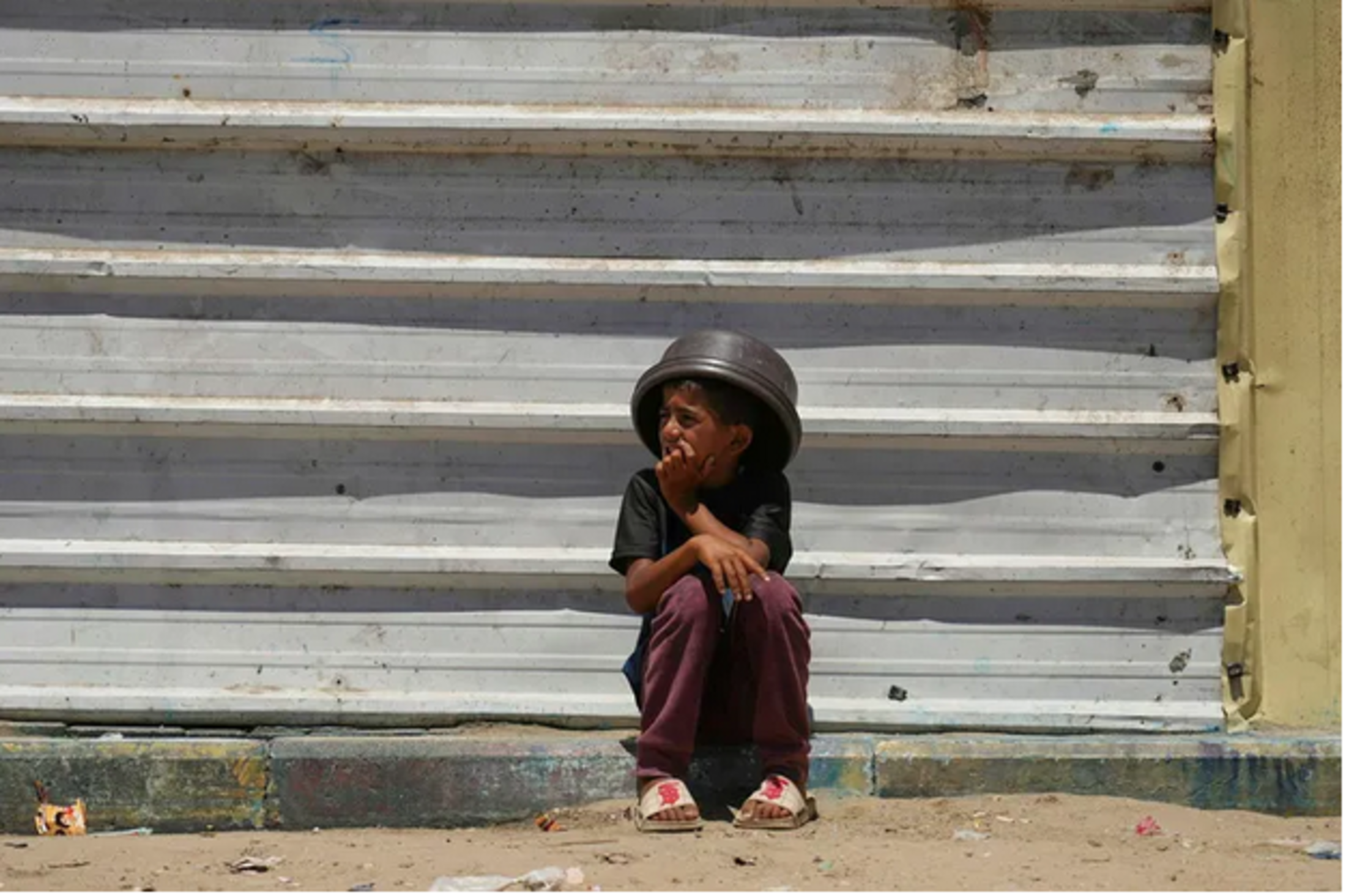Un enfant palestinien près d'une cuisine distribuant de la nourriture