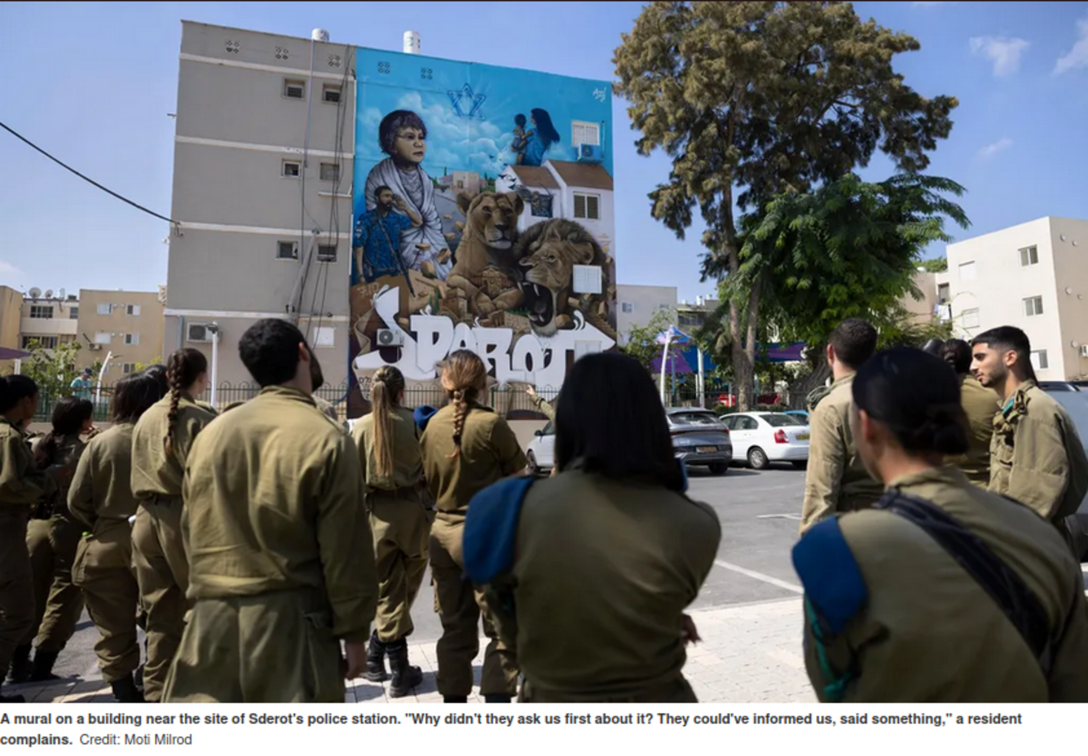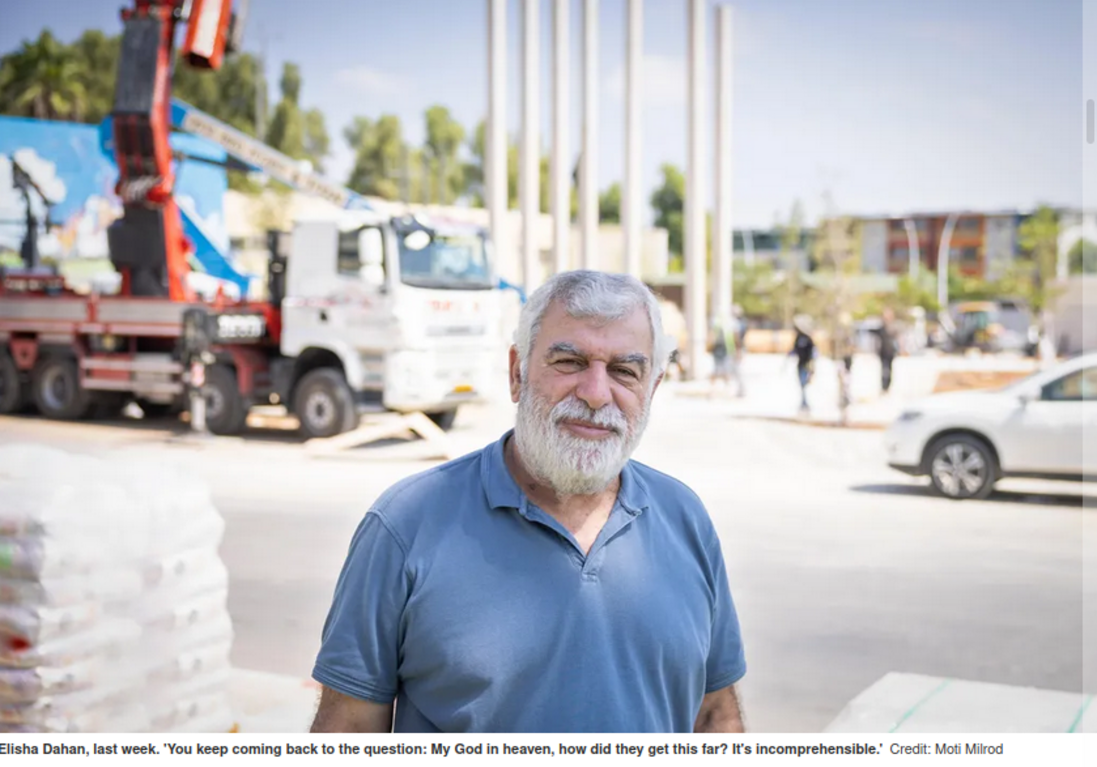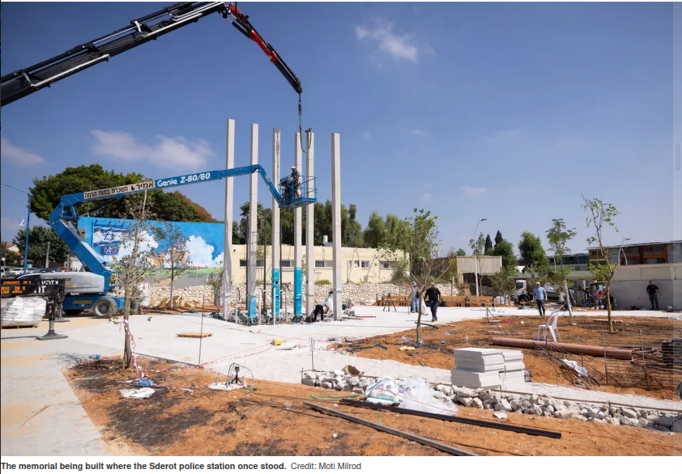 Les communautés du Néguev occidental proches de la bande de Gaza se préparent au premier anniversaire. Au kibboutz Be'eri, on se dépêche d'enterrer les dizaines de morts qui ont été initialement inhumés dans d'autres lieux ; les funérailles suivent de près. Le kibboutz Nir Oz prévoit une cérémonie commémorative dans le cimetière situé à côté de son jardin botanique. Le site de la rave Nova près du kibboutz Re'im ressemble également à un chantier de construction. Et ici, à Sderot, le monument est en cours d'érection.